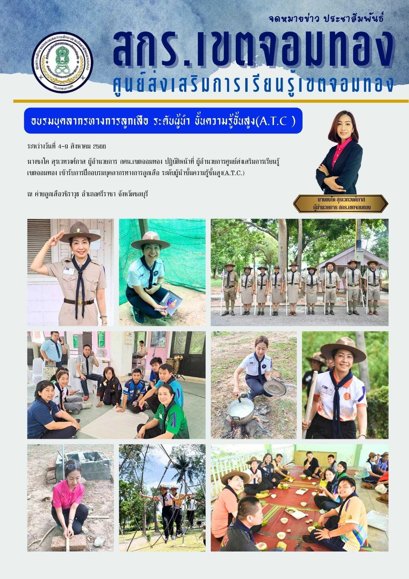 ระหว่างวันที่ 4-9 สิงหาคม 2566 นางชงโค สุรเวทวงศ์ภาส ผู้อำนวยการ กศน.เขตจอมทอง ปฏิบัติหน้าที่ ผู้อำนวยการศูนย์ส่งเสริมการเรียนรู้เขตจอมทอง เข้ารับการฝึกอบรมบุคลากรทางการลูกเสือ ระดับผู้นำขั้นความรู้ชั