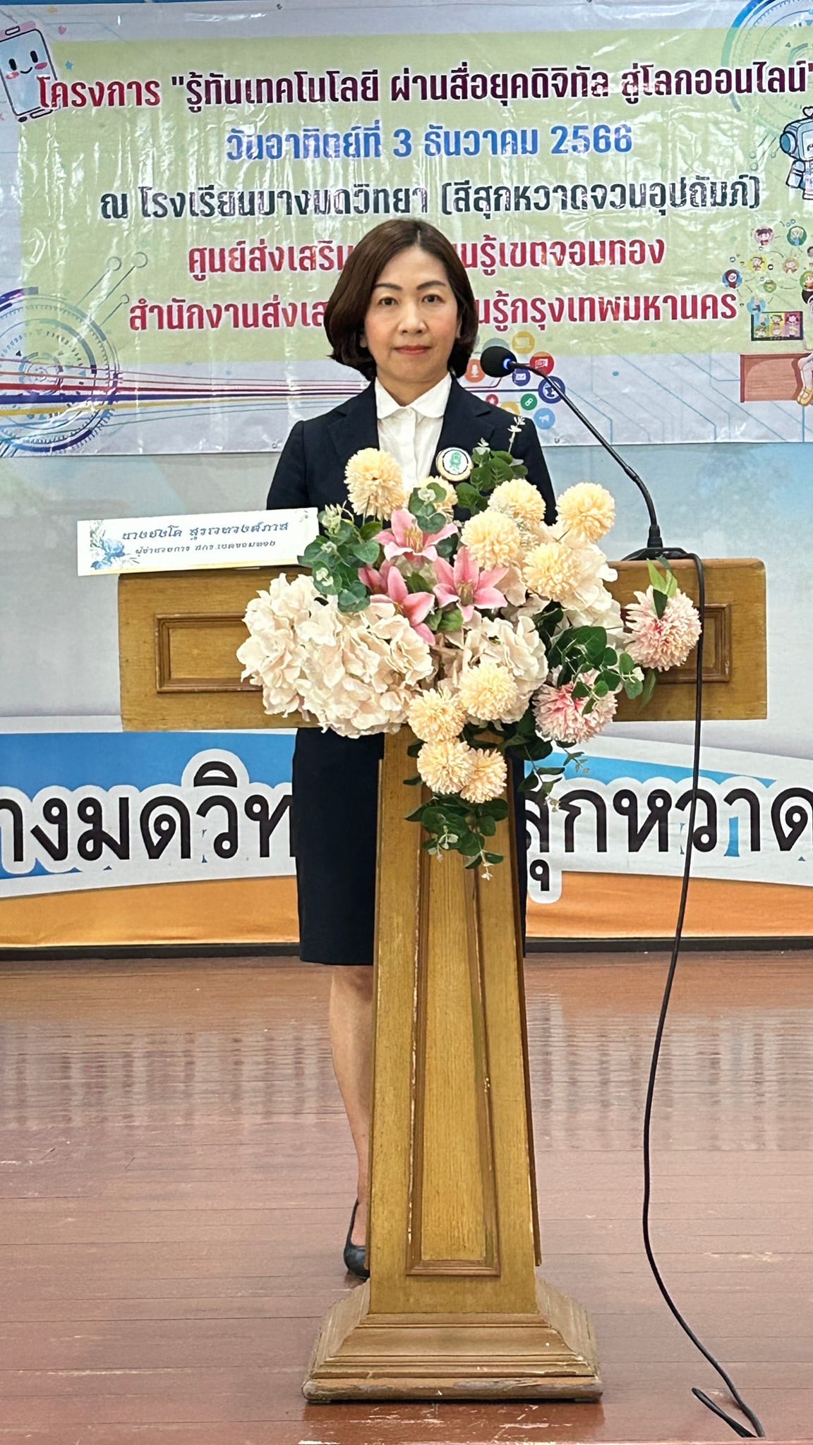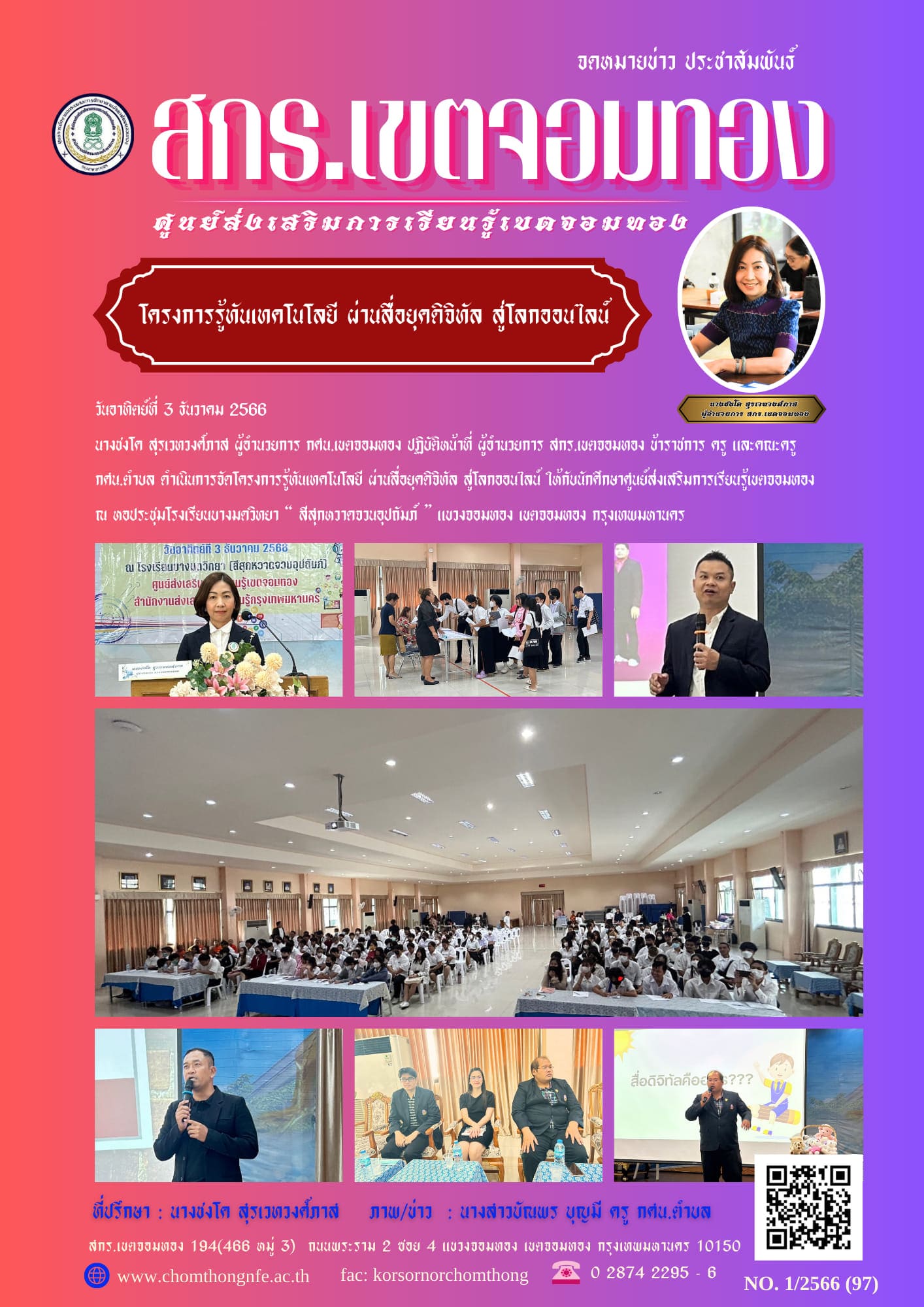 วันอาทิตย์ที่ 3 ธันวาคม 2566 นางชงโค สุรเวทวงศ์ภาส ผู้อำนวยการ กศน.เขตจอมทอง ปฏิบัติหน้าที่ ผู้อำนวยการ สกร.เขตจอมทอง ข้าราชการ ครู และคณะครู กศน.ตำบล ดำเนินการจัดโครงการรู้ทันเทคโนโลยี ผ่านสื่อยุคดิจ