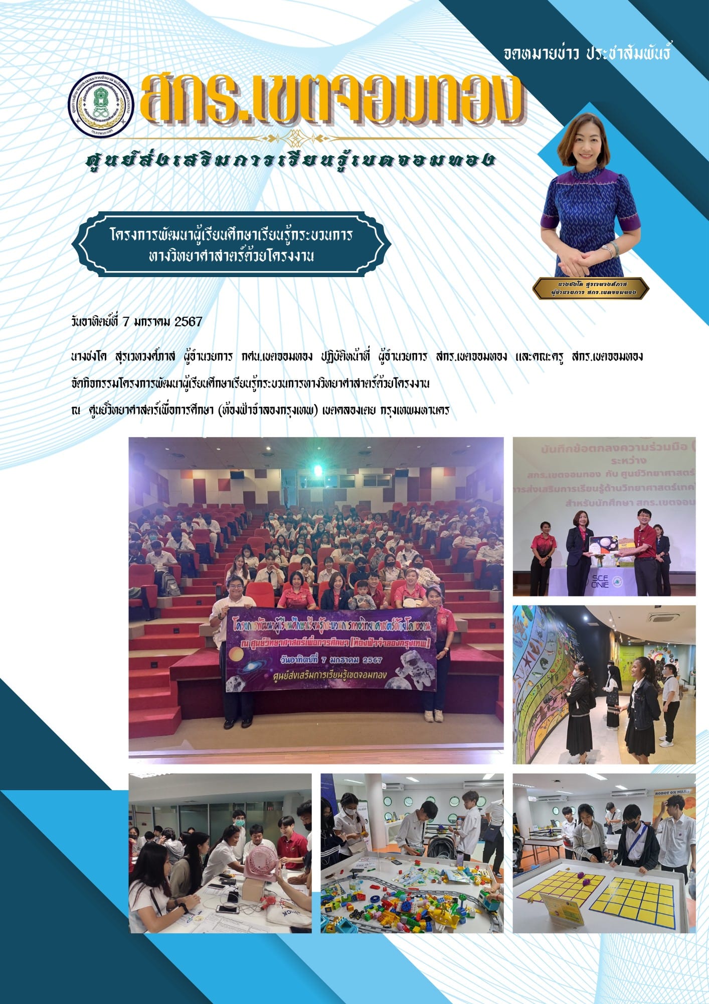 วันอาทิตย์ที่ 7 มกราคม 2567 นางชงโค สุรเวทวงศ์ภาส ผู้อำนวยการ กศน.เขตจอมทอง ปฏิบัติหน้าที่ ผู้อำนวยการ สกร.เขตจอมทอง และคณะครู สกร.เขตจอมทอง จัดกิจกรรมโครงการพัฒนาผู้เรียนศึกษาเรียนรู้กร