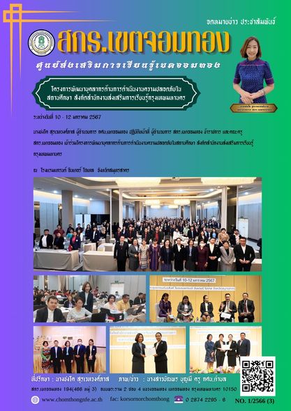 ระหว่างวันที่ 10 - 12 มกราคม 2567 นางชงโค สุรเวทวงศ์ภาส ผู้อำนวยการ กศน.เขตจอมทอง ปฏิบัติหน้าที่ ผู้อำนวยการ สกร.เขตจอมทอง ข้าราชการ และคณะครู สกร.เขตจอมทอง เข้าร่วมโครงการพัฒนาบุคลากรด้านการดำเนินงาน