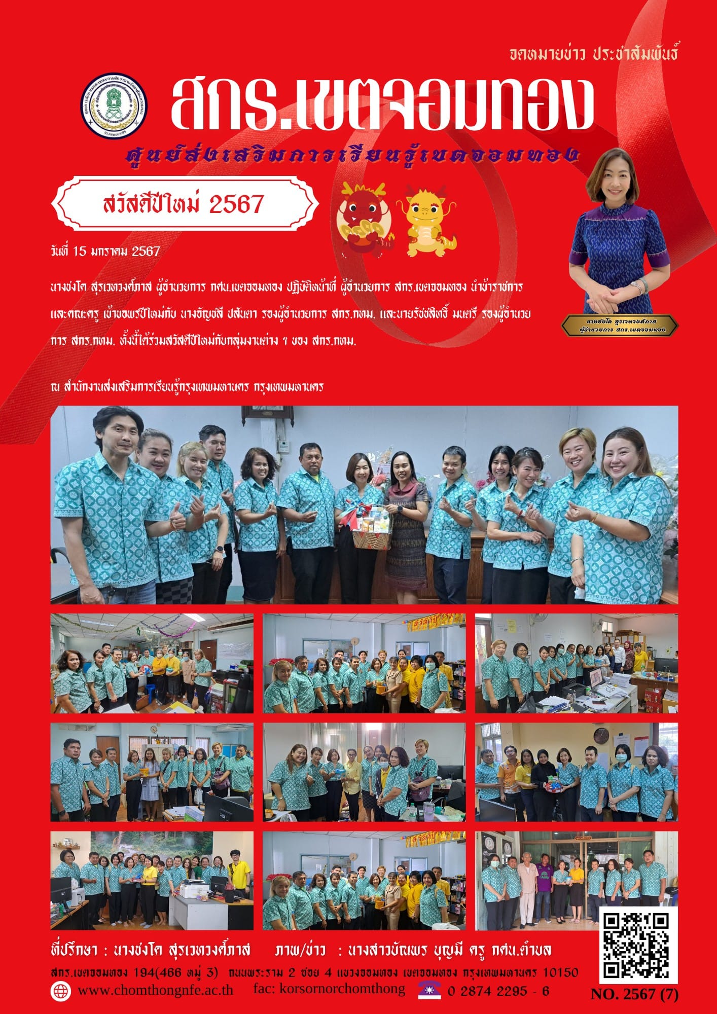 วันที่ 15 มกราคม 2567 นางชงโค สุรเวทวงศ์ภาส ผู้อำนวยการ กศน.เขตจอมทอง ปฏิบัติหน้าที่ ผู้อำนวยการ สกร.เขตจอมทอง นำข้าราชการ และคณะครู เข้าขอพรปีใหม่กับ นางอัญชลี ปสันตา รองผู้อำนวยการ สกร.กทม. และนายรั