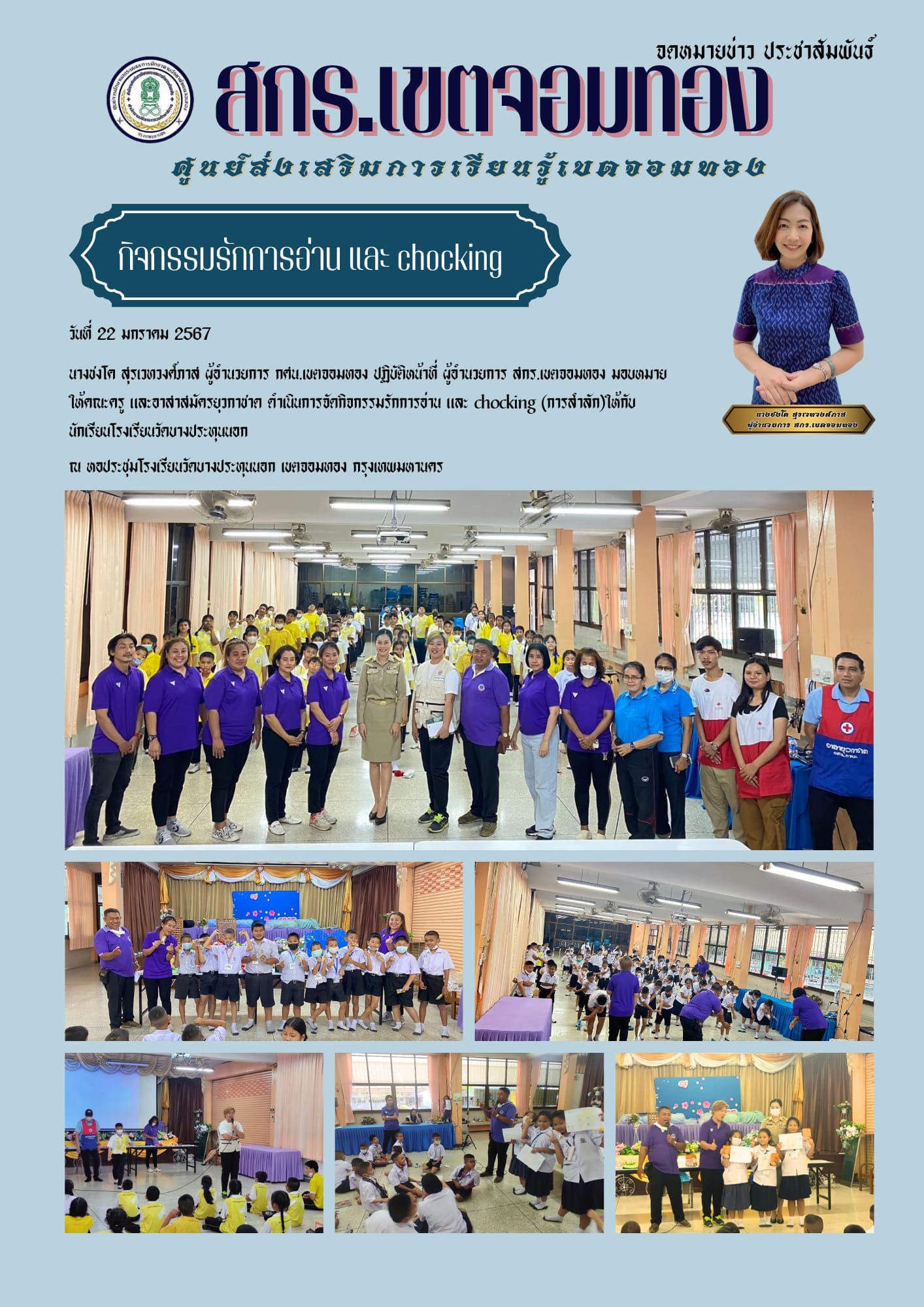วันที่ 22 มกราคม 2567 นางชงโค สุรเวทวงศ์ภาส ผู้อำนวยการ กศน.เขตจอมทอง ปฏิบัติหน้าที่ ผู้อำนวยการ สกร.เขตจอมทอง มอบหมายให้คณะครู และอาสาสมัครยุวกาชาด ดำเนินการจัดกิจกรรมรักการอ่าน และ chocking (การสำลั