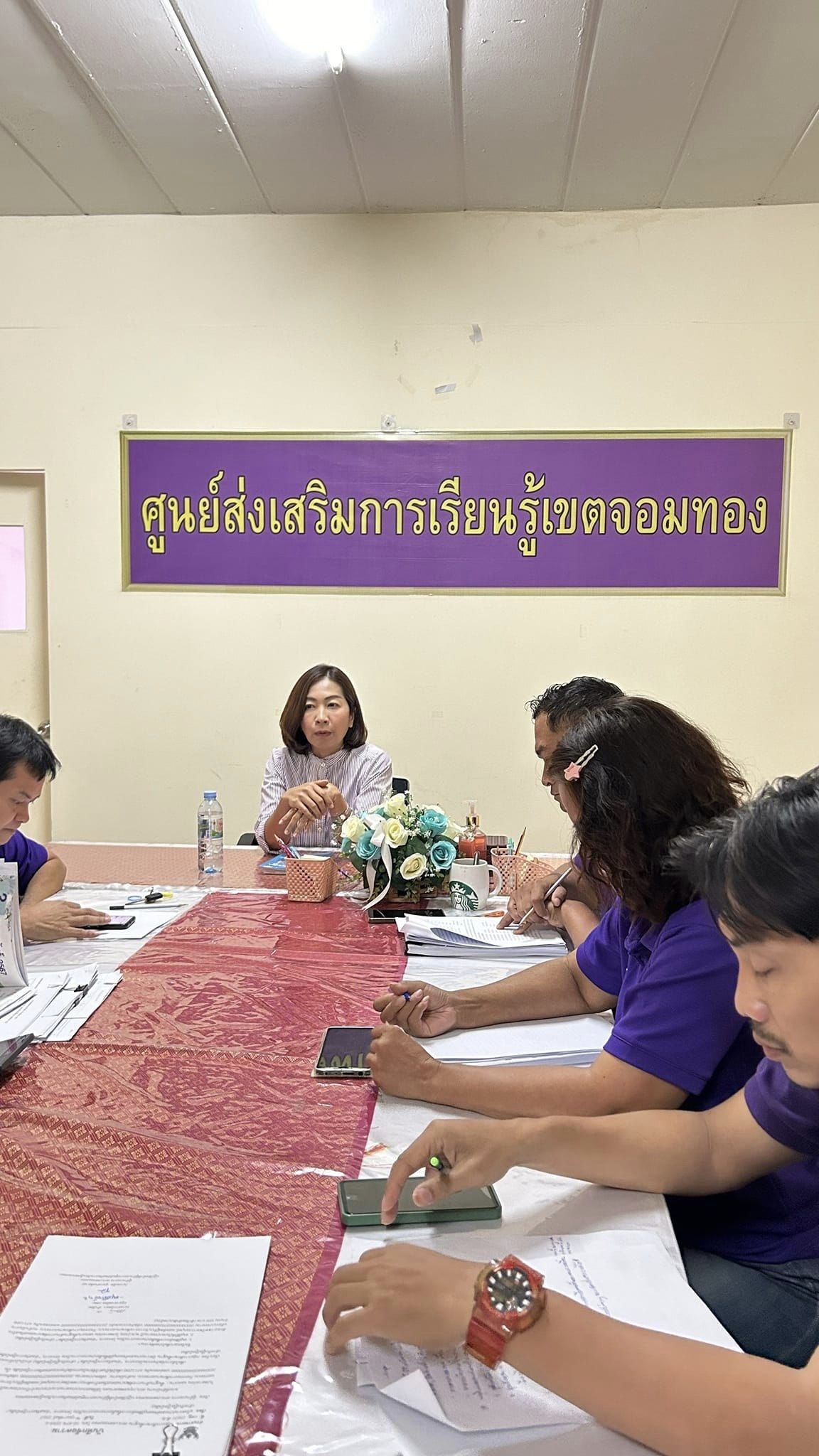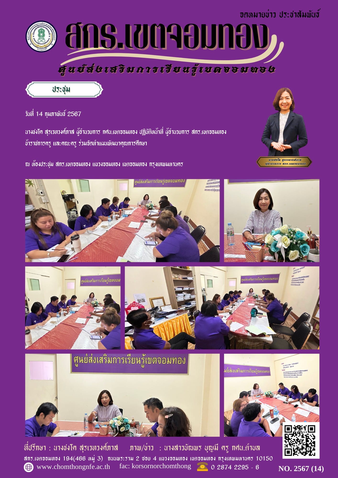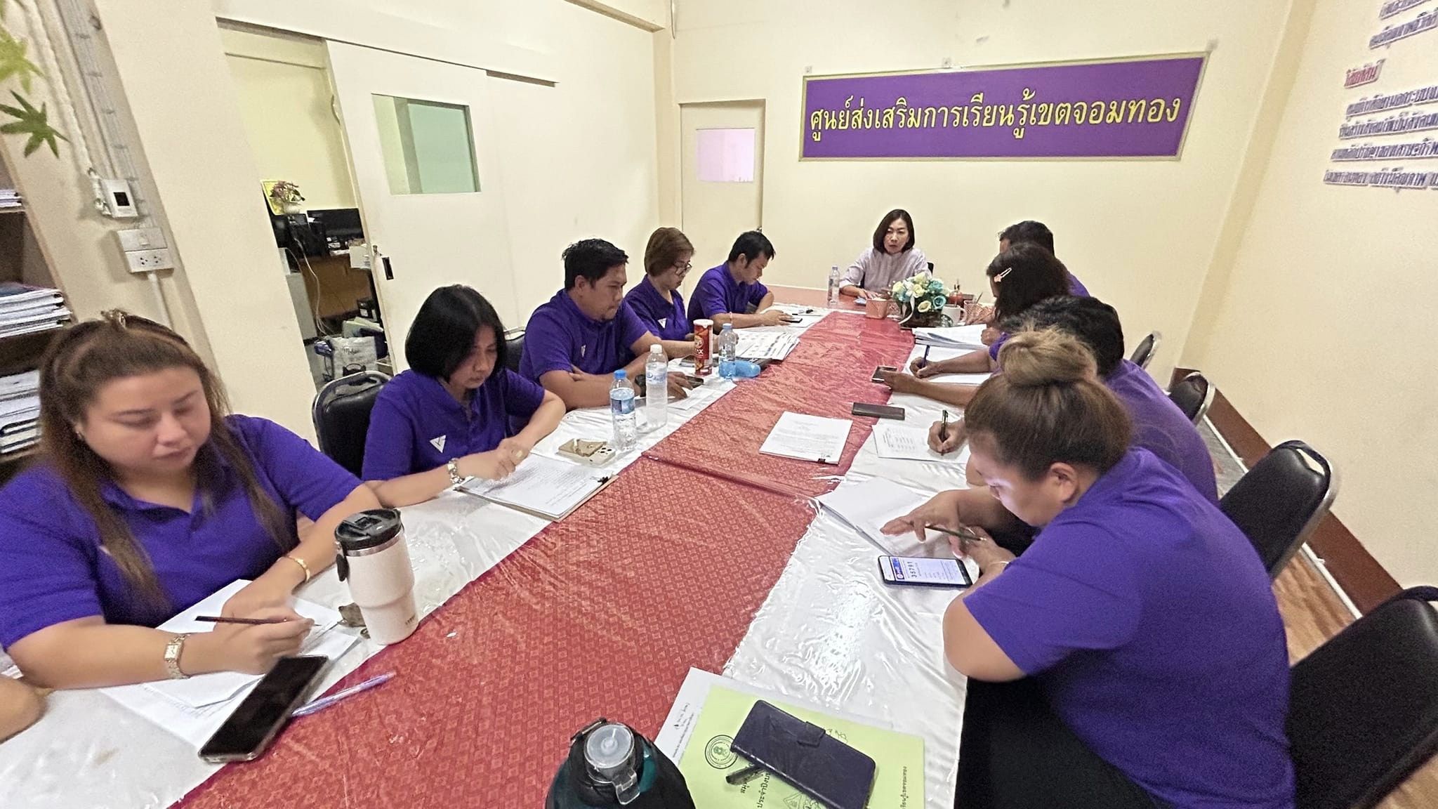 วันที่ 14 กุมภาพันธ์ 2567 นางชงโค สุรเวทวงศ์ภาส ผู้อำนวยการ กศน.เขตจอมทอง ปฏิบัติหน้าที่ ผู้อำนวยการ สกร.เขตจอมทอง ข้าราชการครู และคณะครู ร่วมจัดทำแผนพัฒนาคุณการศึกษา ณ ห้องประชุม สกร.เขตจอมทอง แขวงจอ