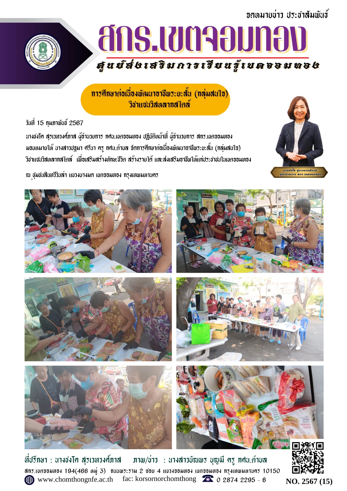 วันที่ 15 กุมภาพันธ์ 2567 นางชงโค สุรเวทวงศ์ภาส ผู้อำนวยการ กศน.เขตจอมทอง ปฏิบัติหน้าที่ ผู้อำนวยการ สกร.เขตจอมทอง มอบหมายให้ นางสาวปฐมา ศรีนา ครู กศน.ตำบล จัดการศึกษาต่อเนื่องพัฒนาอาชีพระยะสั้น (กลุ่