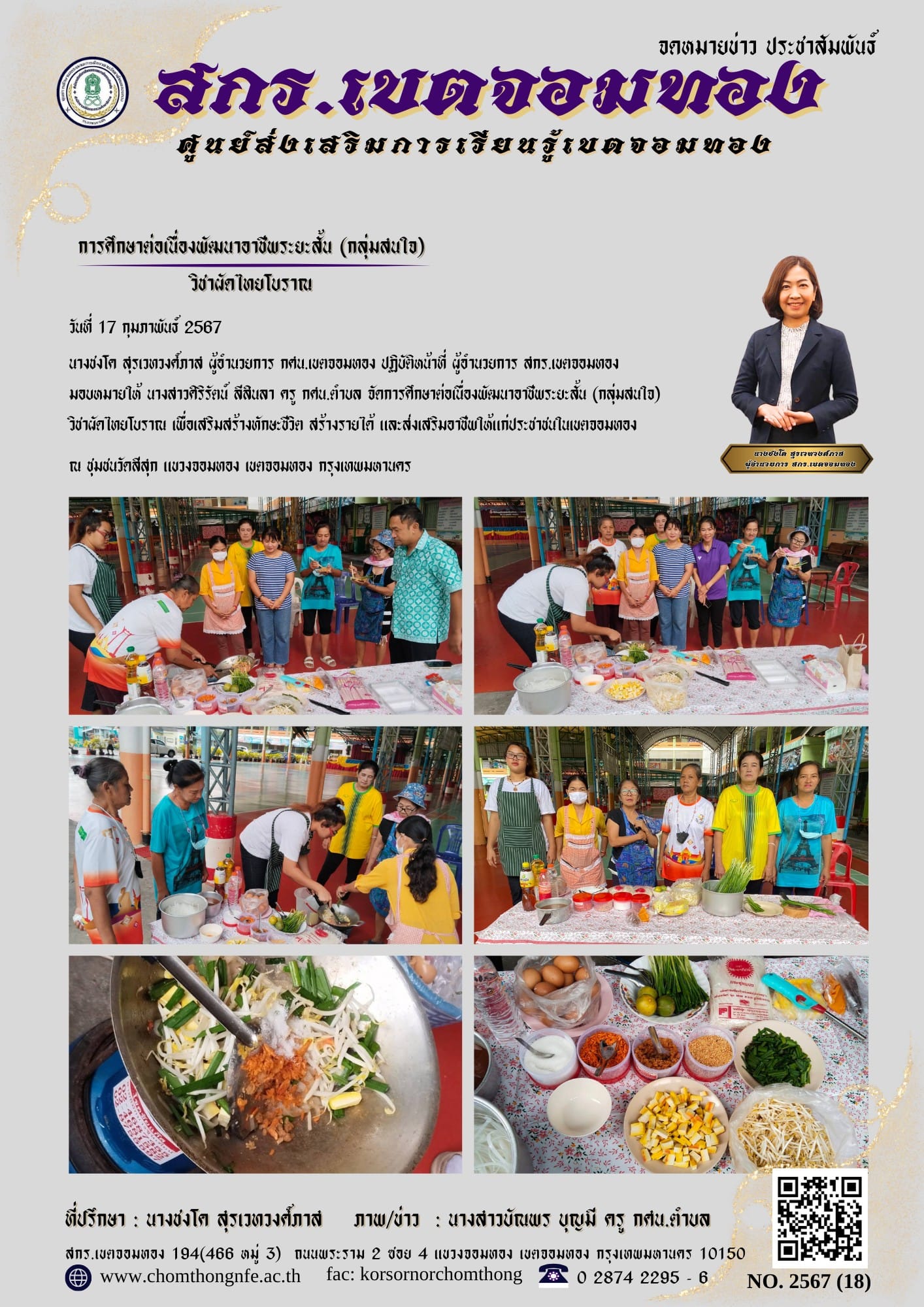 วันที่ 17 กุมภาพันธ์ 2567 นางชงโค สุรเวทวงศ์ภาส ผู้อำนวยการ กศน.เขตจอมทอง ปฏิบัติหน้าที่ ผู้อำนวยการ สกร.เขตจอมทอง มอบหมายให้ นางสาวศิริรัตน์ ลีสินลา ครู กศน.ตำบล จัดการศึกษาต่อเนื่องพัฒนาอาชีพระยะสั