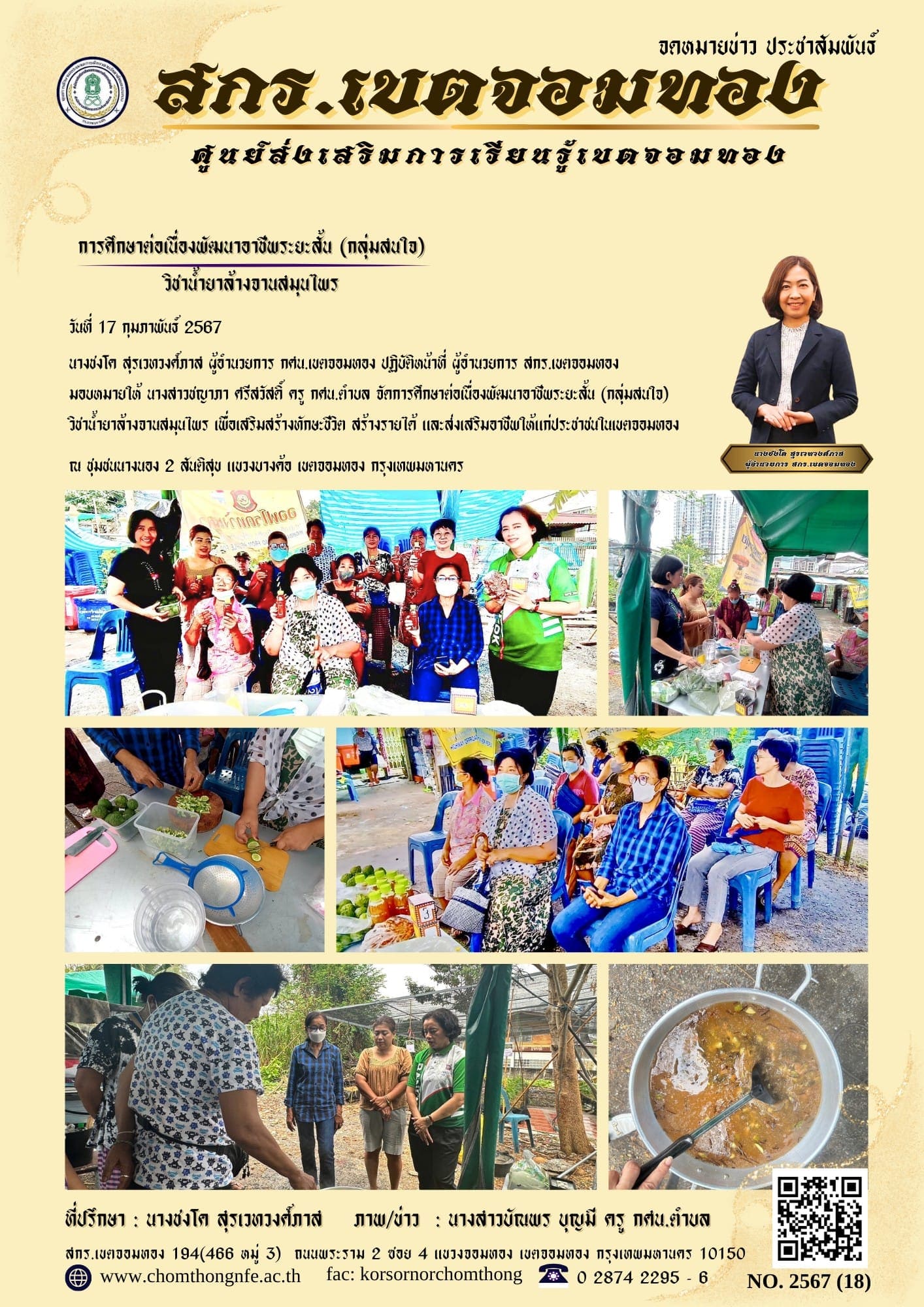 วันที่ 17 กุมภาพันธ์ 2567 นางชงโค สุรเวทวงศ์ภาส ผู้อำนวยการ กศน.เขตจอมทอง ปฏิบัติหน้าที่ ผู้อำนวยการ สกร.เขตจอมทอง มอบหมายให้ นางสาวชญาภา ศรีสวัสดิ์ ครู กศน.ตำบล จัดการศึกษาต่อเนื่องพัฒนาอาชีพระยะสั้