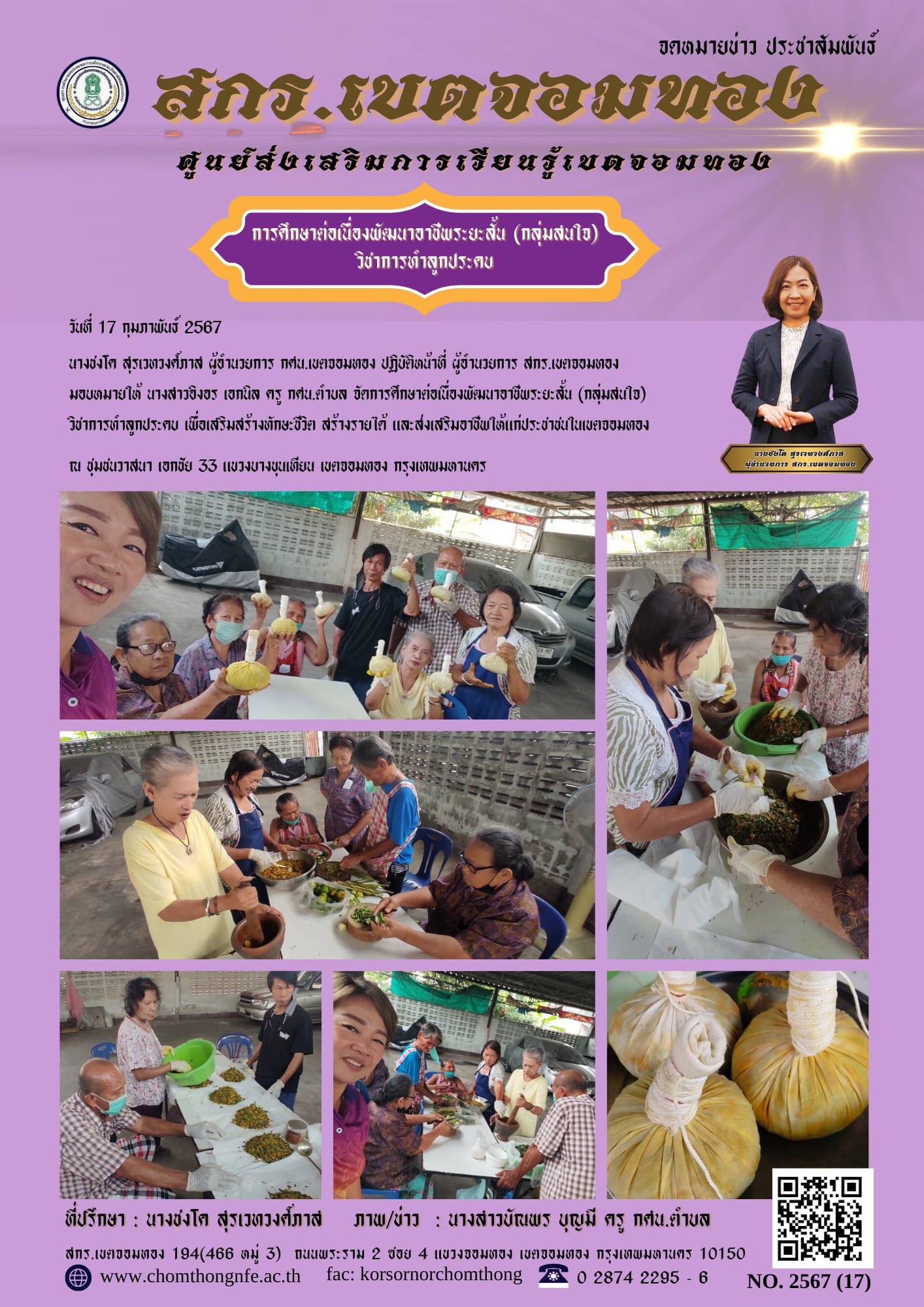 วันที่ 17 กุมภาพันธ์ 2567 นางชงโค สุรเวทวงศ์ภาส ผู้อำนวยการ กศน.เขตจอมทอง ปฏิบัติหน้าที่ ผู้อำนวยการ สกร.เขตจอมทอง มอบหมายให้ นางสาวอิงอร เอกนิล ครู กศน.ตำบล จัดการศึกษาต่อเนื่องพัฒนาอาชีพระยะสั้น (ก