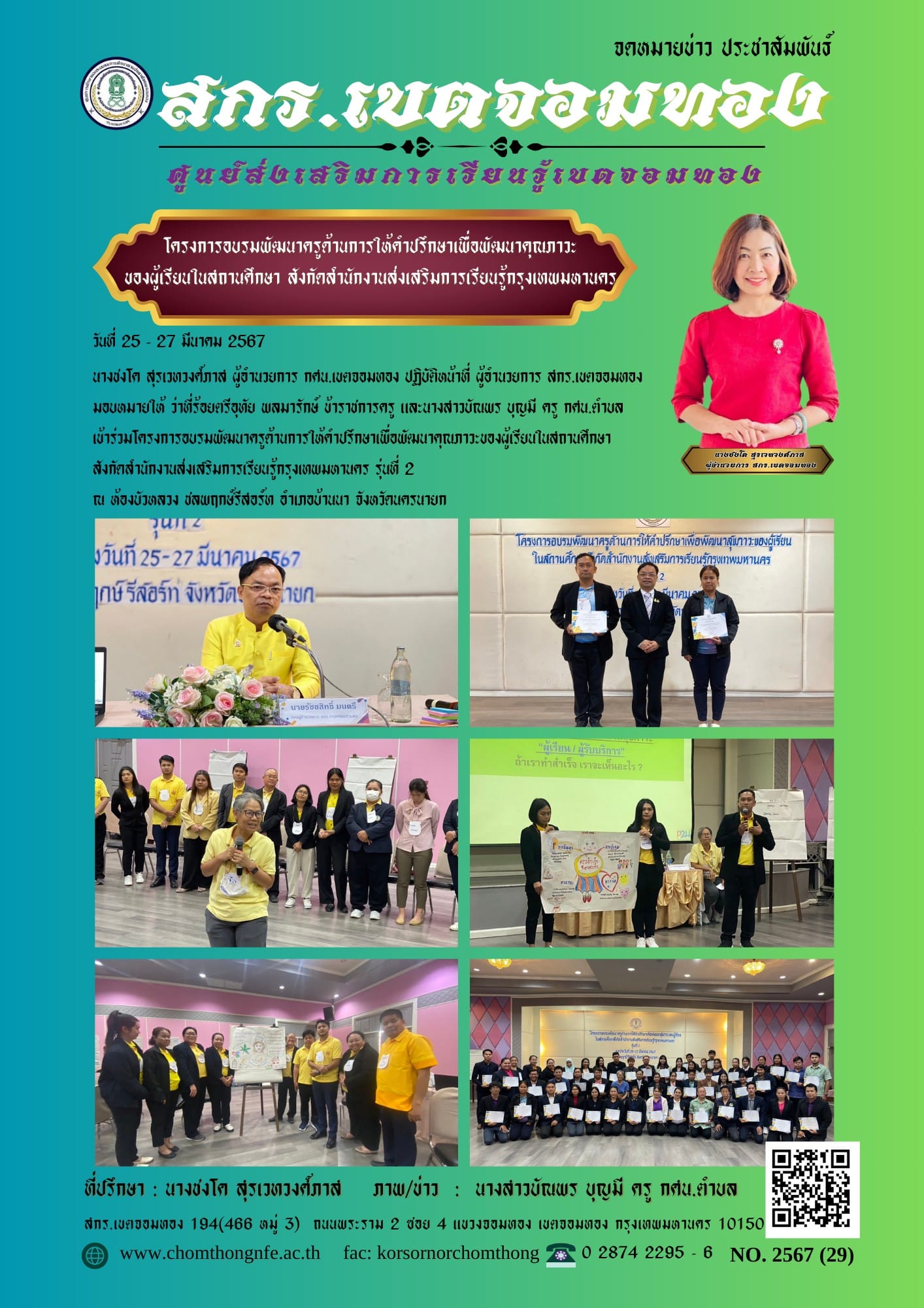 นางชงโค สุรเวทวงศ์ภาส ผู้อำนวยการ กศน.เขตจอมทอง ปฏิบัติหน้าที่ ผู้อำนวยการ สกร.เขตจอมทอง มอบหมายให้ ว่าที่ร้อยตรีอุทัย พลมารักษ์ ข้าราชการครู และนางสาวบัณพร บุญมี ครู กศน.ตำบล เข้าร่วมโครงการอบรมพัฒนาครูด้านการให้คำปรึกษาเพื่อพัฒนาคุณภาวะของผู้เรียนในสถานศึกษาสังกัดสำนักงานส่งเสริมการเรียนรู้กรุงเทพมหานคร รุ่นที่ 2