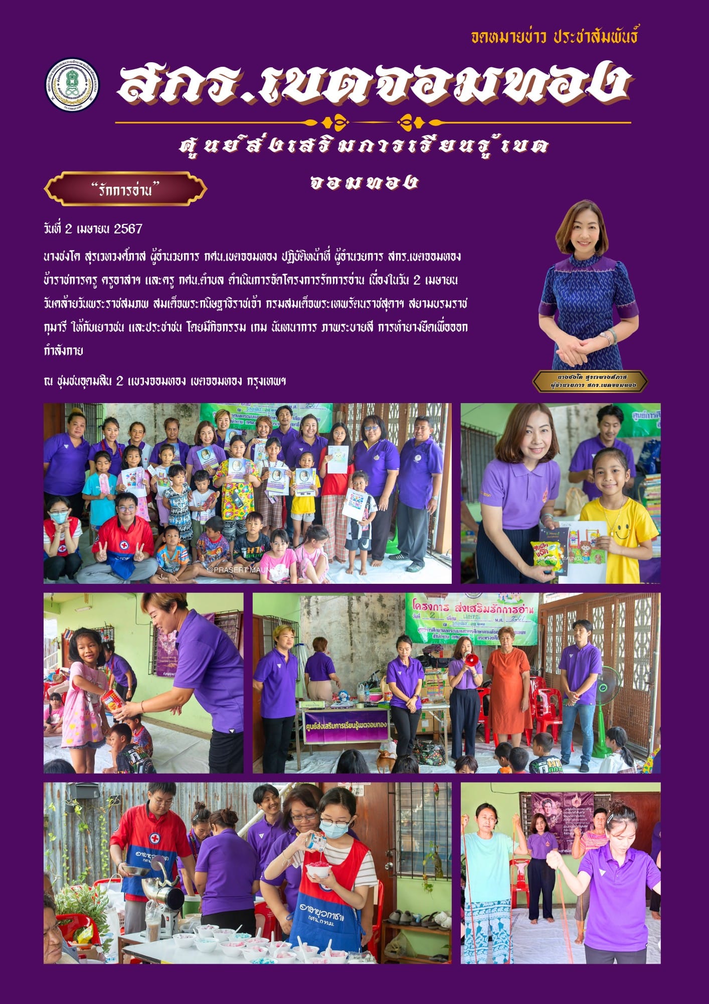 นางชงโค สุรเวทวงศ์ภาส ผู้อำนวยการ กศน.เขตจอมทอง ปฏิบัติหน้าที่ ผู้อำนวยการ สกร.เขตจอมทอง ข้าราชการครู ครูอาสาฯ และครู กศน.ตำบล ดำเนินการจัดโครงการรักการอ่าน เนื่องในวัน 2 เมษายนวันคล้ายวันพระราชสมภพ สมเด็จพระกนิษฐาธิราชเจ้า กรมสมเด็จพระเทพรัตนราชสุดาฯ สยามบรมราชกุมารี ให้กับเยาวชน และประชาชน โดยมีกิจกรรม เกม นันทนาการ ภาพระบายสี การทำยางยืดเพื่อออกกำลังกาย