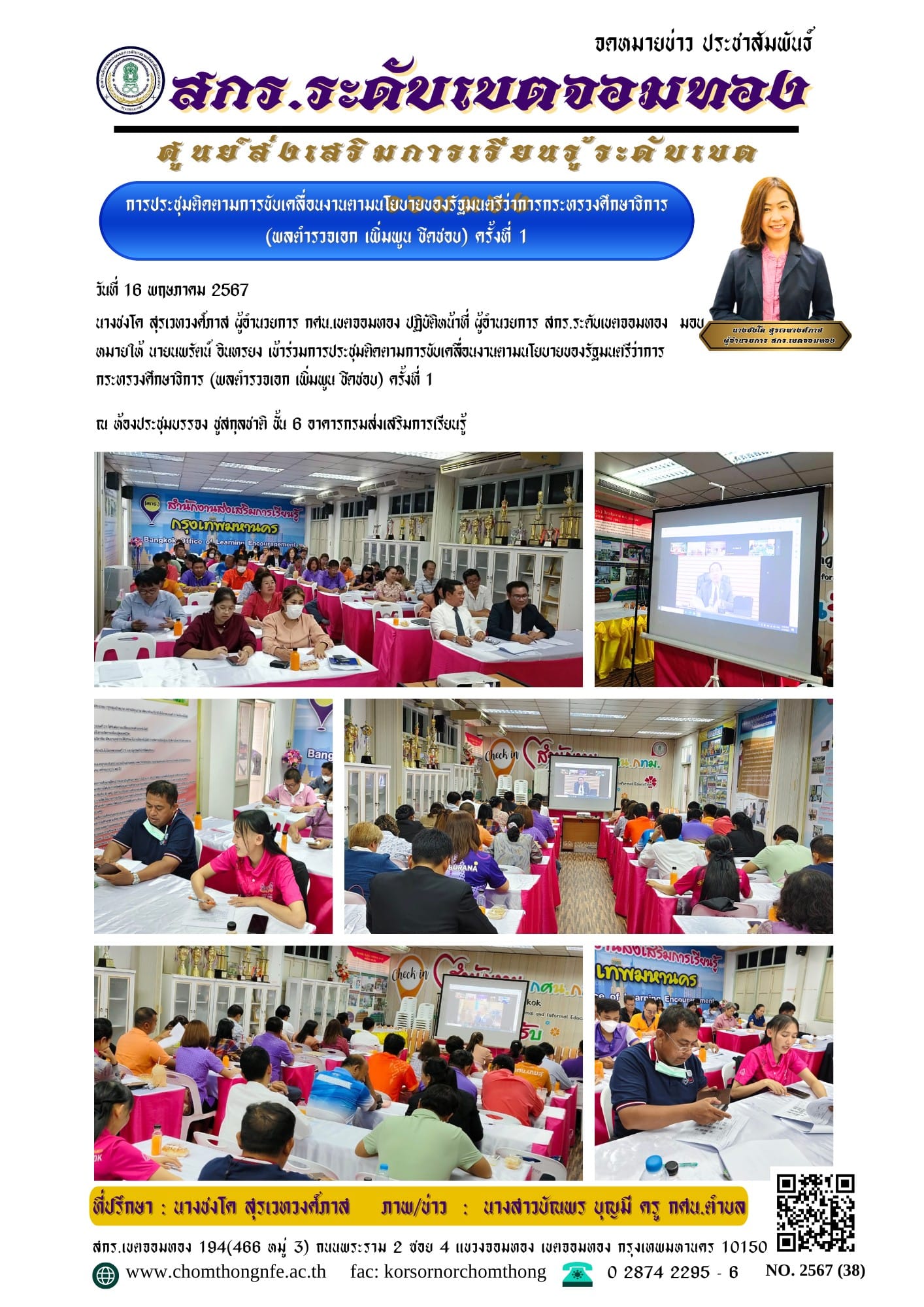 นางชงโค สุรเวทวงศ์ภาส ผู้อำนวยการ กศน.เขตจอมทอง ปฏิบัติหน้าที่ ผู้อำนวยการ สกร.ระดับเขตจอมทอง มอบหมายให้ นายนพรัตน์ อินทรยง เข้าร่วมการประชุมติดตามการขับเคลื่อนงานตามนโยบายของรัฐมนตรีว่าการกระทรวงศึกษาธิการ (พลตำรวจเอก เพิ่มพูน ชิดชอบ) ครั้งที่ 1