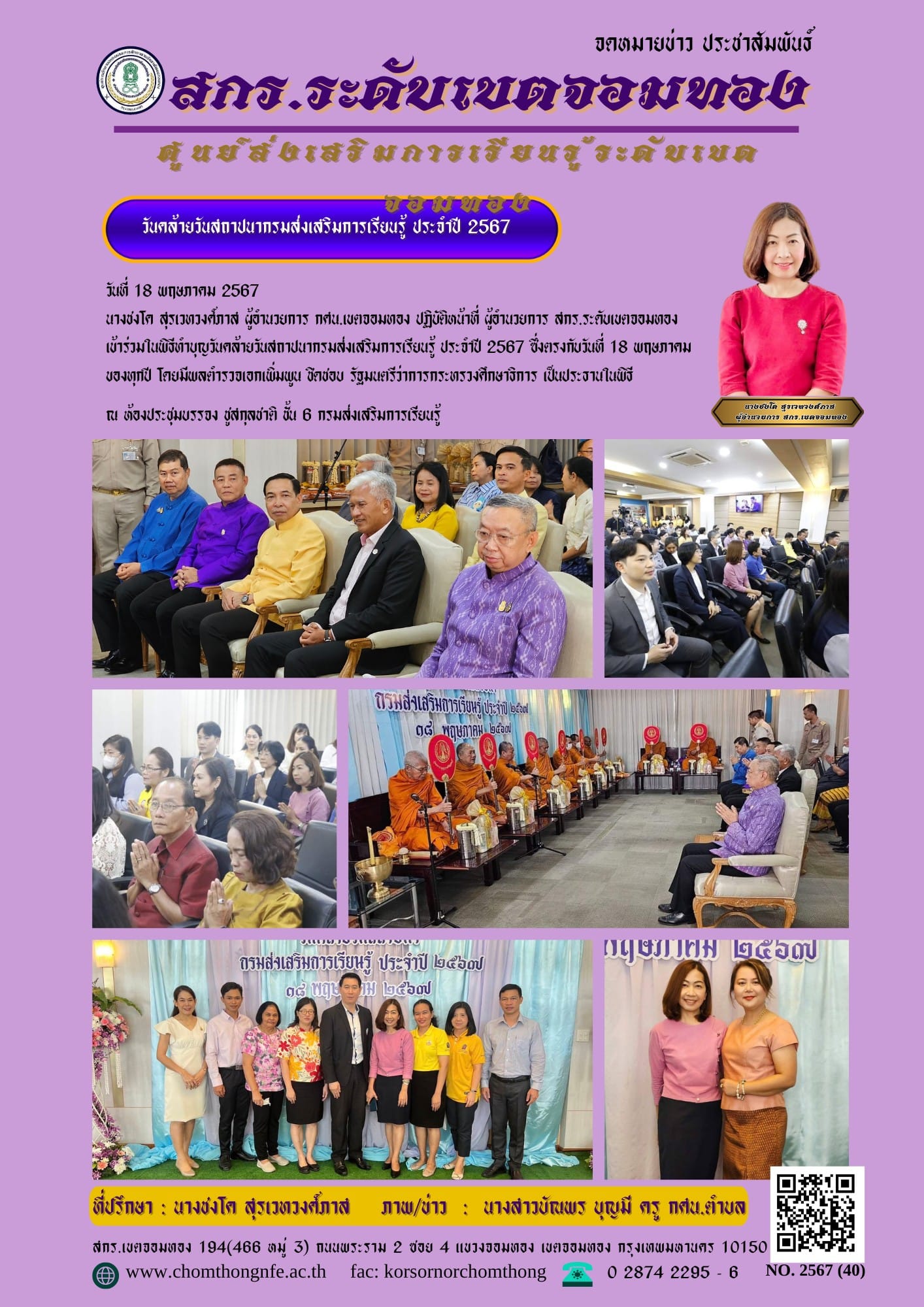 นางชงโค สุรเวทวงศ์ภาส ผู้อำนวยการ กศน.เขตจอมทอง ปฏิบัติหน้าที่ ผู้อำนวยการ สกร.ระดับเขตจอมทอง เข้าร่วมในพิธีทำบุญวันคล้ายวันสถาปนากรมส่งเสริมการเรียนรู้ ประจำปี 2567 ซึ่งตรงกับวันที่ 18 พฤษภาคมของทุกปี โดยมีพลตำรวจเอกเพิ่มพูน ชิดชอบ รัฐมนตรีว่าการกระทรวงศึกษาธิการ เป็นประธานในพิธี