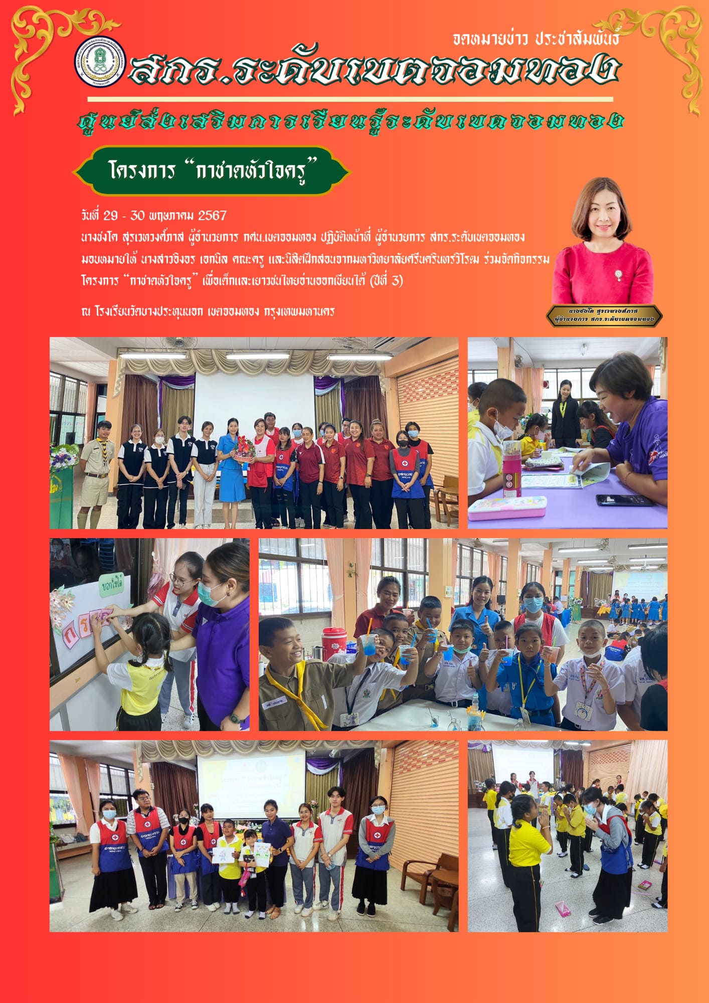 นางชงโค สุรเวทวงศ์ภาส ผู้อำนวยการ กศน.เขตจอมทอง ปฏิบัติหน้าที่ ผู้อำนวยการ สกร.ระดับเขตจอมทอง มอบหมายให้ นางสาวอิงอร เอกนิล คณะครู และนิสิตฝึกสอนจากมหาวิทยาลัยศรีนครินทรวิโรฒ ร่วมจัดกิจกรรมโครงการ “กาชาดหัวใจครู” เพื่อเด็กและเยาวชนไทยอ่านออกเขียนได้ (ปีที่ 3)