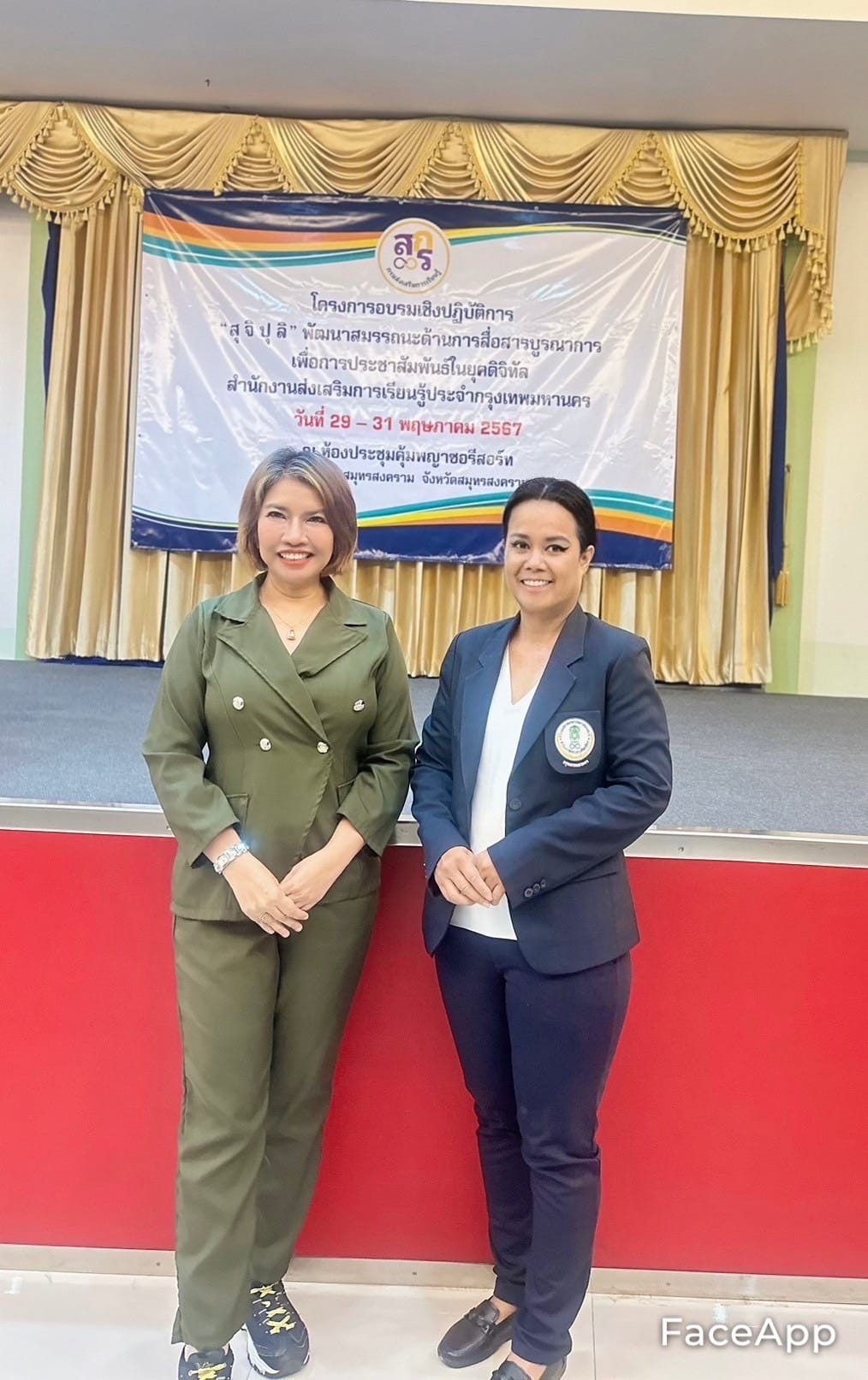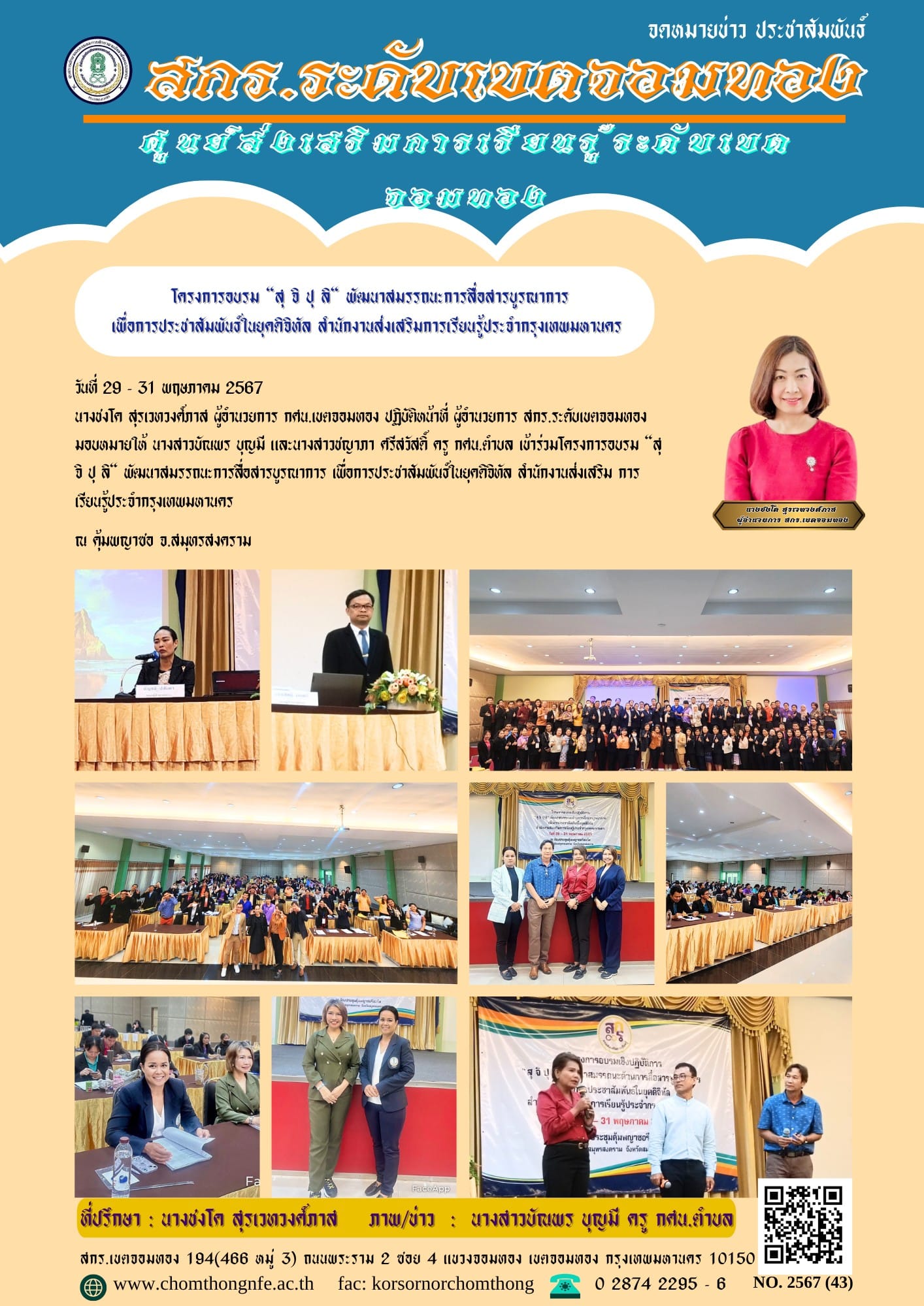 นางชงโค สุรเวทวงศ์ภาส ผู้อำนวยการ กศน.เขตจอมทอง ปฏิบัติหน้าที่ ผู้อำนวยการ สกร.ระดับเขตจอมทอง มอบหมายให้ นางสาวบัณพร บุญมี และนางสาวชญาภา ศรีสวัสดิ์ ครู กศน.ตำบล เข้าร่วมโครงการอบรม “สุ จิ ปุ ลิ“ พัฒนาสมรรถนะการสื่อสารบูรณาการ เพื่อการประชาสัมพันธ์ในยุคดิจิทัล สำนักงานส่งเสริม การเรียนรู้ประจำกรุงเทพมหานคร