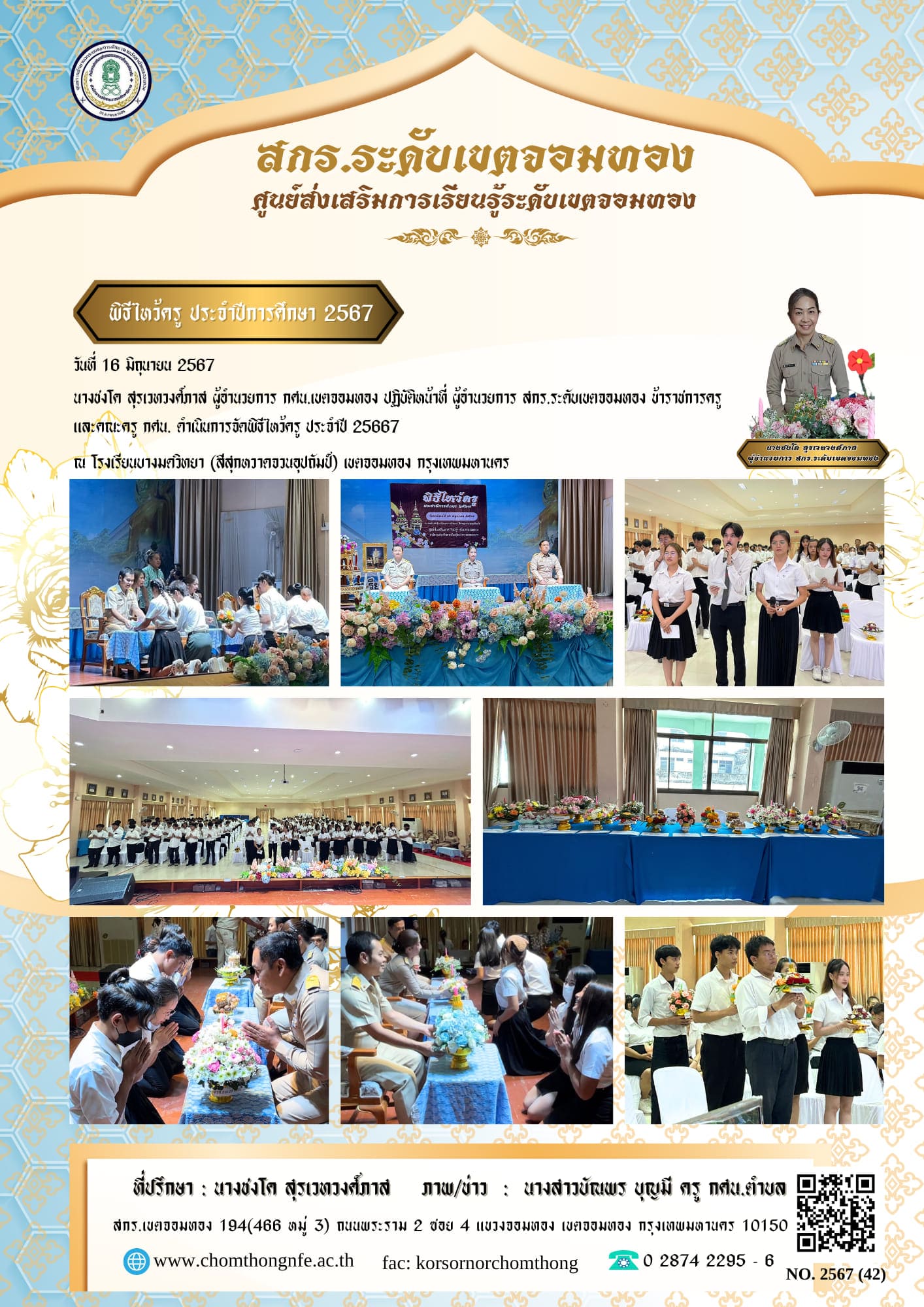 นางชงโค สุรเวทวงศ์ภาส ผู้อำนวยการ กศน.เขตจอมทอง ปฏิบัติหน้าที่ ผู้อำนวยการ สกร.ระดับเขตจอมทอง ข้าราชการครู และคณะครู กศน. ดำเนินการจัดพิธีไหว้ครู ประจำปี 25667