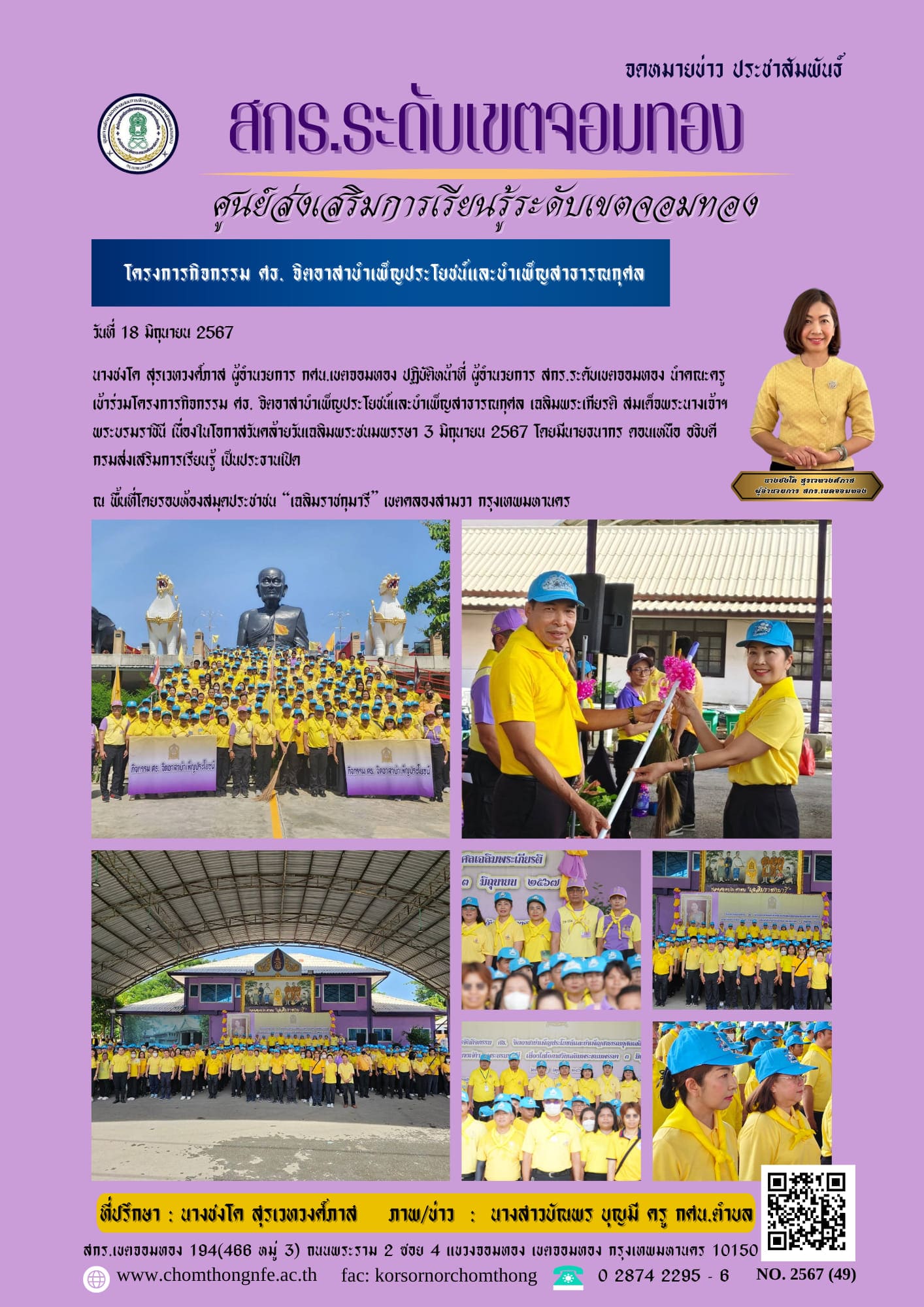 นางชงโค สุรเวทวงศ์ภาส ผู้อำนวยการ กศน.เขตจอมทอง ปฏิบัติหน้าที่ ผู้อำนวยการ สกร.ระดับเขตจอมทอง นำคณะครู เข้าร่วมโครงการกิจกรรม ศธ. จิตอาสาบำเพ็ญประโยชน์และบำเพ็ญสาธารณกุศล เฉลิมพระเกียรติ สมเด็จพระนางเจ้าฯ พระบรมราชินี เนื่องในโอกาสวันคล้ายวันเฉลิมพระชนมพรรษา 3 มิถุนายน 2567 โดยมีนายธนากร ดอนเหนือ อธิบดีกรมส่งเสริมการเรียนรู้ เป็นประธานเปิด
