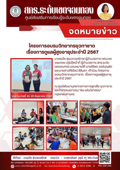 นางชงโค สุรเวทวงศ์ภาส ผู้อำนวยการ กศน.เขตจอมทอง ปฏิบัติหน้าที่ ผู้อำนวยการ สกร.ระดับเขตจอมทอง มอบหมายให้ นางศิริพร วงษ์บุญส่ง และนางสาวศิริรัตน์ ลีสินลา เข้าร่วม โครงการอบรมวิทยากรยุวกาชาด เรื่องการดูแลผู้สูงอายุประจำปี 2567