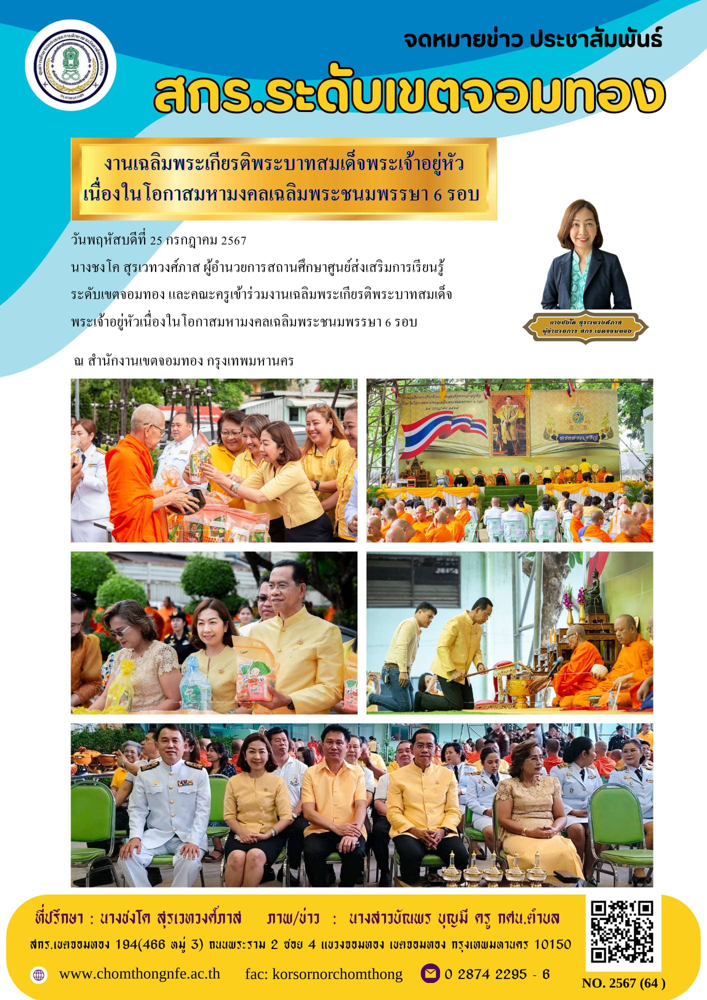 นางชงโค สุรเวทวงศ์ภาส ผู้อำนวยการสถานศึกษาศูนย์ส่งเสริมการเรียนรู้ระดับเขตจอมทอง และคณะครูเข้าร่วมงานเฉลิมพระเกียรติพระบาทสมเด็จพระเจ้าอยู่หัวเนื่องในโอกาสมหามงคลเฉลิมพระชนมพรรษา 6 รอบ