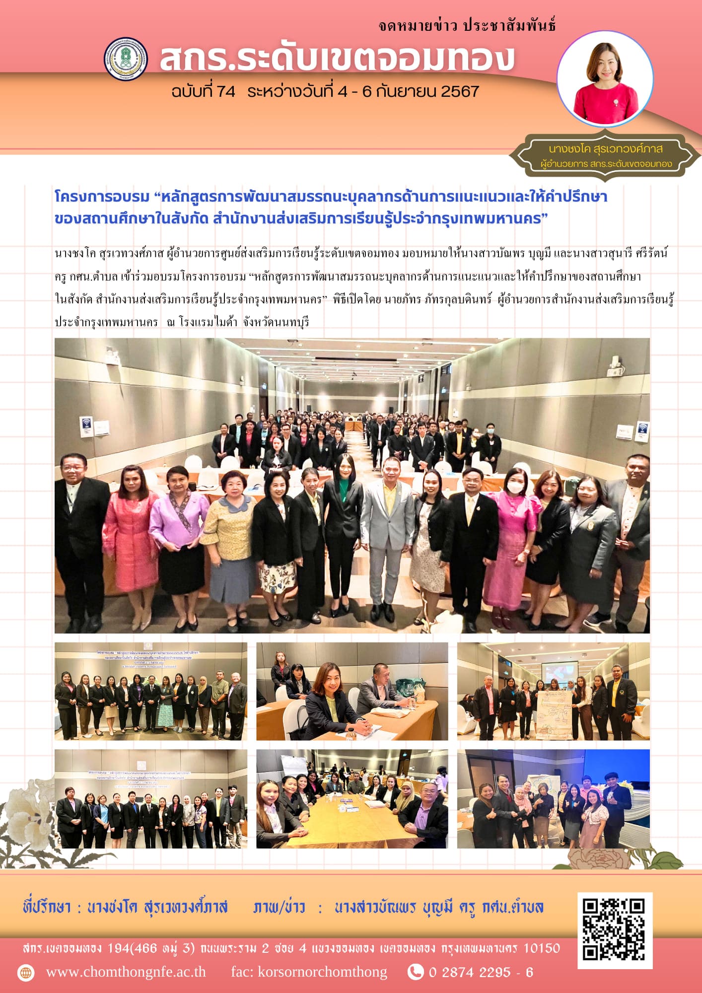 ระหว่างวันที่ 4 - 6 กันยายน 2567 นางชงโค สุรเวทวงศ์ภาส ผู้อำนวยการศูนย์ส่งเสริมการเรียนรู้ระดับเขตจอ