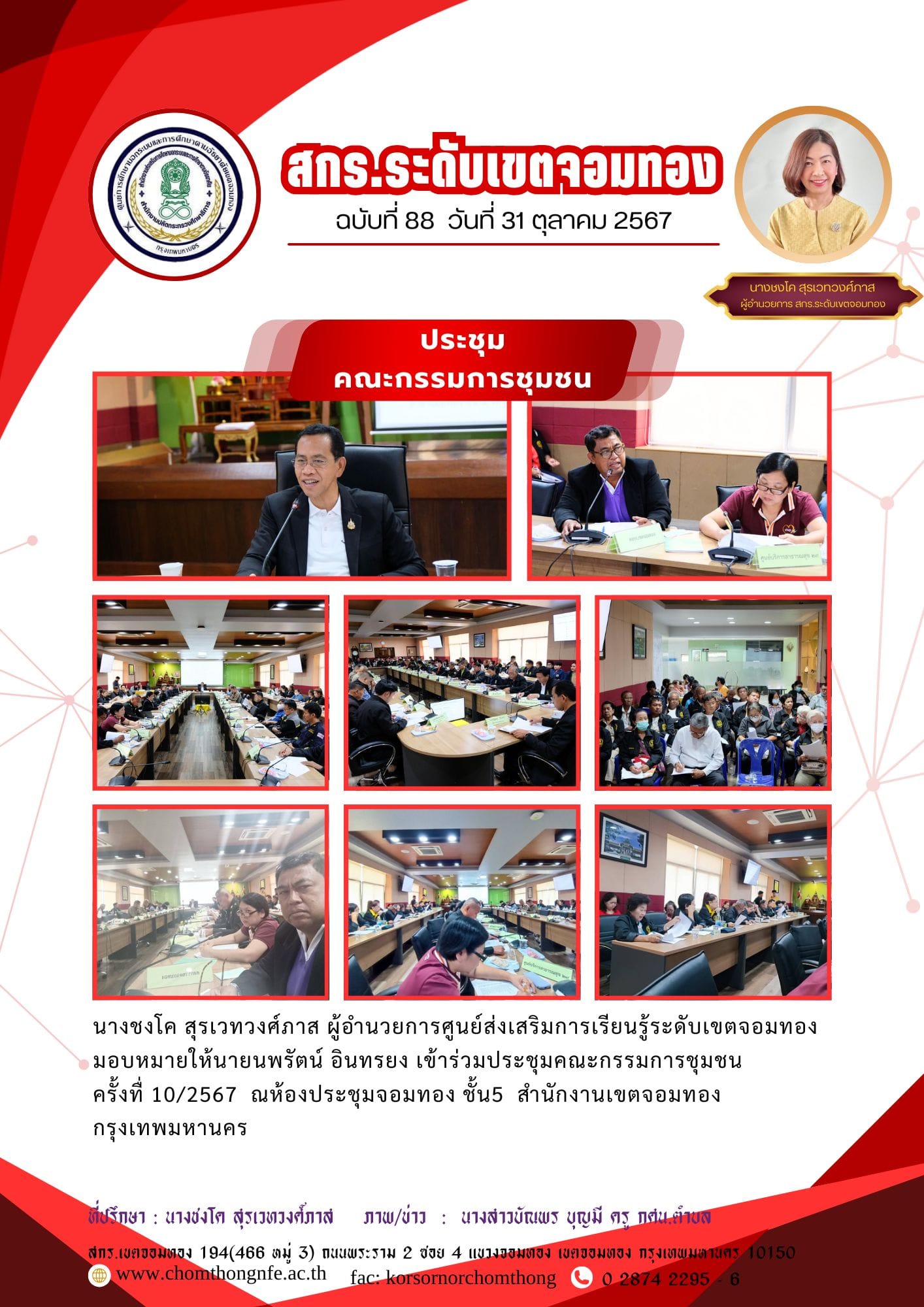 31 ตุลาคม 2567 นางชงโค สุรเวทวงศ์ภาส ผู้อำนวยการศูนย์ส่งเสริมการเรียนรู้ระดับเขตจอมทอง มอบหมายให้นายนพรัตน์ อินทรยง เข้าร่วมประชุมคณะกรรมการชุมชน ครั้งทื่ 10/2567 ณห้องประชุมจอมทอง ชั้น5 สำนักงานเขตจอมทอง กรุงเทพมหานคร