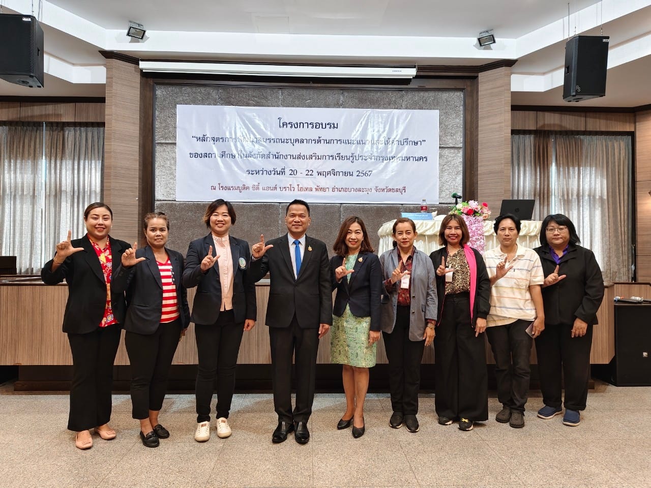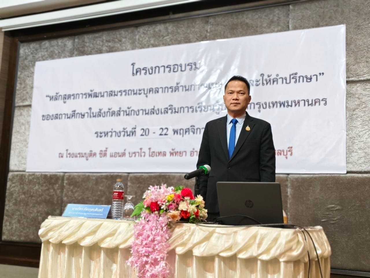 นางชงโค สุรเวทวงศ์ภาส ผู้อำนวยการศูนย์ส่งเสริมการเรียนรู้ระดับเขตจอมทอง นำข้าราชการ คณะครู และเจ้าหน้าที่เข้าร่วมโครงการอบรม “หลักสูตรการพัฒนาสมรรถนะบุคลากรด้านการแนะแนวและให้คำปรึกษา” ของสถานศึกษาในสังกัดสำนักงานส่งเสริมการเรียนรู้ประจำกรุงเทพมหานคร ระหว่างวันที่ 20 - 22 พฤศจิกายน 2567 ณ โรงแรมบูติค ซิตี้ แอนด์ บราโว่โฮเต็ลพัทยา อำเภอบางละมุง จังหวัดชลบุรี