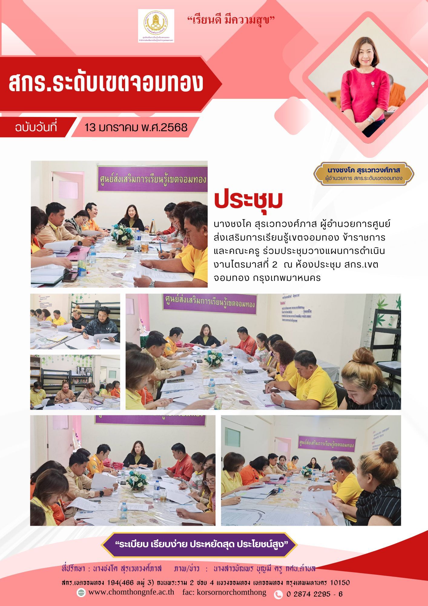 13 มกราคม 2568 นางชงโค สุรเวทวงศ์ภาส ผู้อำนวยการศูนย์ส่งเสริมการเรียนรู้เขตจอมทอง ข้าราชการ และคณะครู ร่วมประชุมวางแผนการดำเนินงานไตรมาสที่ 2 ณ ห้องประชุม สกร.เขตจอมทอง กรุงเทพมาหนคร