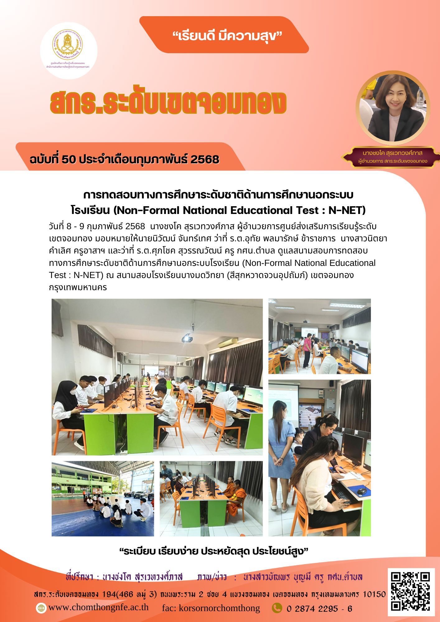 8 - 9 กุมภาพันธ์ 2568 นางชงโค สุรเวทวงศ์ภาสผู้อำนวยการศูนย์ส่งเสริมการเรียนรู้ระดับเขตจอมทองมอบหมายให้นายนิวัฒน์ จันทร์เทศ ว่าที่ ร.ต.อุทัย พลมารักษ์ ข้าราชการ นางสาวนิตยา คำเลิศ ครูอาสาฯ และว่าที่ ร.ต.ศุภโชค สุวรรณวัฒน์ ครู กศน.ตำบล ดูแลสนามสอบการทดสอบทางการศึกษาระดับชาติด้านการศึกษานอกระบบโรงเรียน (Non-Formal National Educational Test : N-NET) ณ สนามสอบโรงเรียนบางมดวิทยา (สีสุกหวาดจวนอุปถัมภ์) เขตจอมทอง กรุงเทพมหานคร