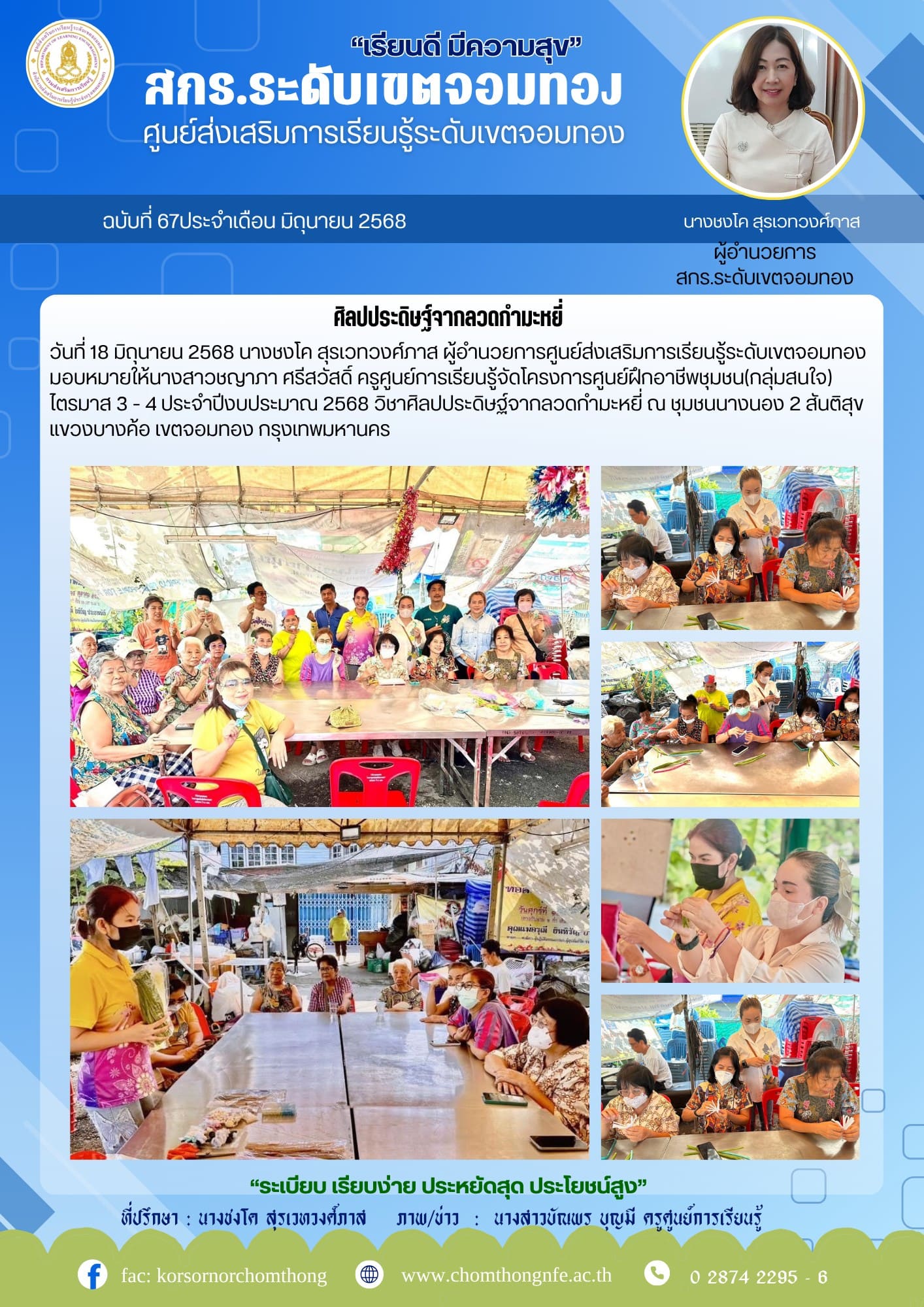 18 มิถุนายน 2568 นางชงโค สุรเวทวงศ์ภาส ผู้อำนวยการศูนย์ส่งเสริมการเรียนรู้ระดับเขตจอมทอง มอบหมายให้นางสาวชญาภา ศรีสวัสดิ์ ครูศูนย์การเรียนรู้จัดโครงการศูนย์ฝึกอาชีพชุมชน(กลุ่มสนใจ) ไตรมาส 3 - 4 ประจำป