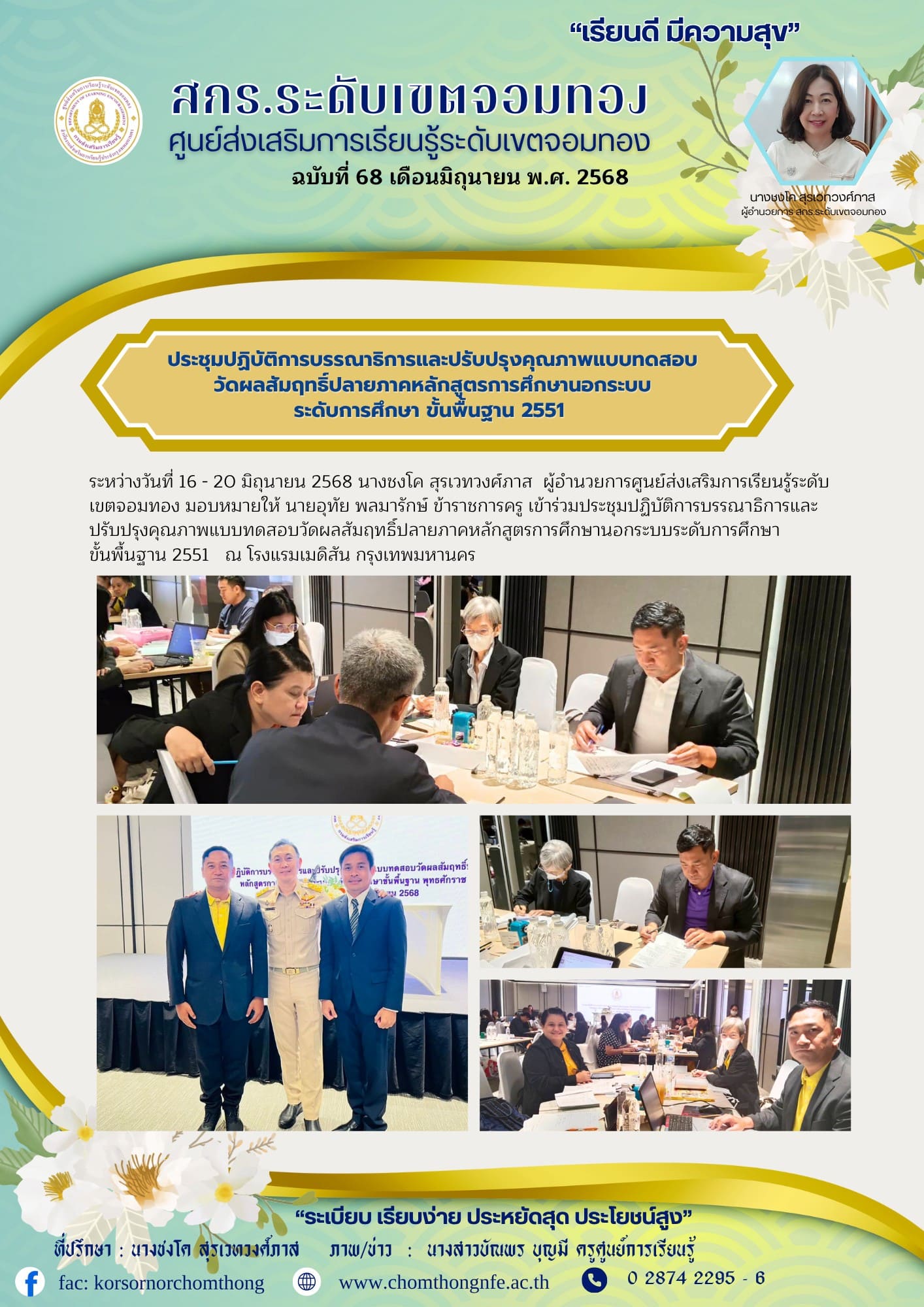 ระหว่างวันที่ 16 - 20 มิถุนายน 2568 นางชงโค สุรเวทวงศ์ภาส ผู้อำนวยการศูนย์ส่งเสริมการเรียนรู้ระดับเขตจอมทอง มอบหมายให้ นายอุทัย พลมารักษ์ ข้าราชการครู เข้าร่วมประชุมปฏิบัติการบรรณาธิการและปรับปรุงคุณภาพแบบทดสอบวัดผลสัมฤทธิ์ปลายภาคหลักสูตรการศึกษานอกระบบระดับการศึกษาขั้นพื้นฐาน 2551 ณ โรงแรมเมดิสันกรุงเทพมหานคร