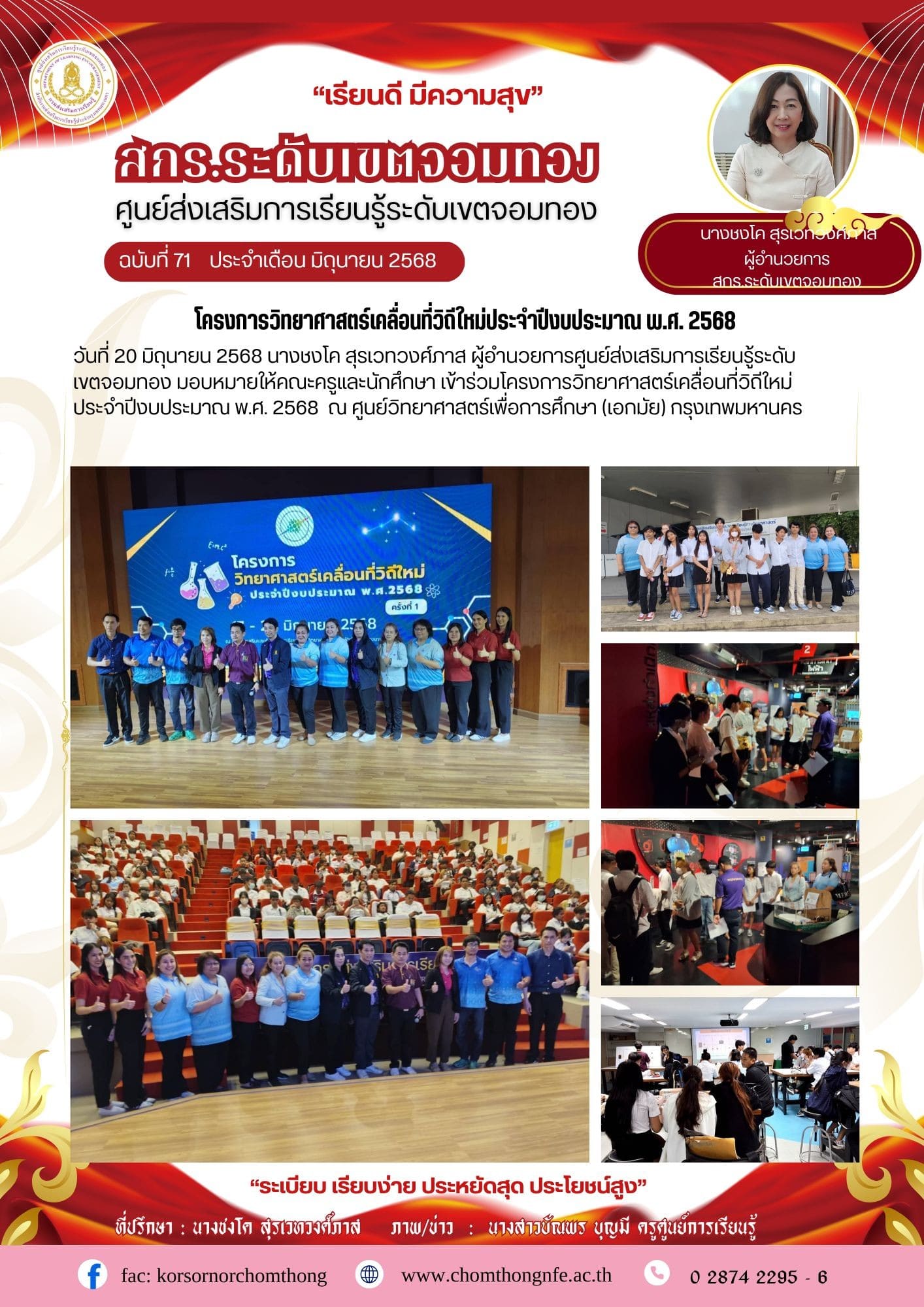 20 มิถุนายน 2568 นางชงโค สุรเวทวงศ์ภาส ผู้อำนวยการศูนย์ส่งเสริมการเรียนรู้ระดับเขตจอมทอง มอบหมายให้คณะครูและนักศึกษา เข้าร่วมโครงการวิทยาศาสตร์เคลื่อนที่วิถีใหม่