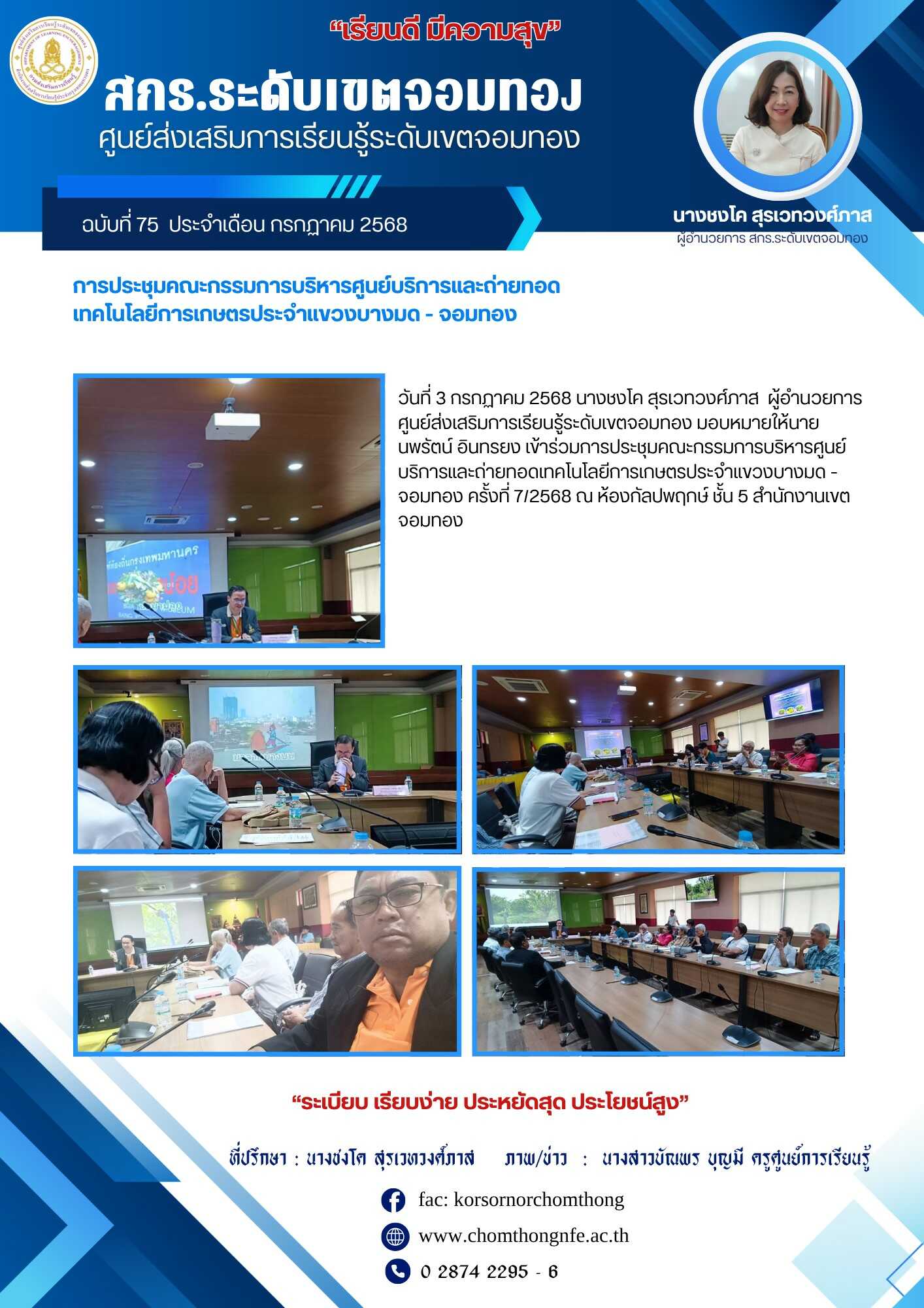 3 กรกฏาคม 2568 นางชงโค สุรเวทวงศ์ภาส ผู้อำนวยการศูนย์ส่งเสริมการเรียนรู้ระดับเขตจอมทอง มอบหมายให้นายนพรัตน์ อินทรยง เข้าร่วมการประชุมคณะกรรมการบริหารศูนย์บริการและถ่ายทอดเทคโนโลยีการเกษตรประจำแขวงบางมด - จอมทอง ครั้งที่ 7/2568 ณ ห้องกัลปพฤกษ์ ชั้น 5 สำนักงานเขตจอมทอง