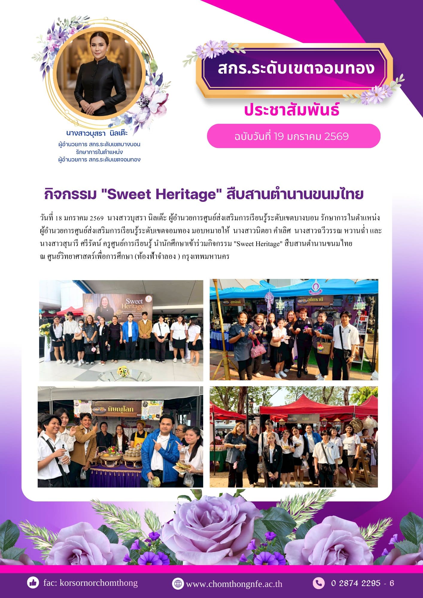 18 มกราคม 2569 นางสาวบุสรา นิลเต๊ะ ผู้อำนวยการศูนย์ส่งเสริมการเรียนรู้ระดับเขตบางบอน รักษาการในตำแหน่ง ผู้อำนวยการศูนย์ส่งเสริมการเรียนรู้ระดับเขตจอมทอง มอบหมายให้ นางสาวนิตยา คำเลิศ นางสาวฉวีวรรณ หวานฉ่ำ และนางสาวสุนารี ศรีรัตน์ ครูศูนย์การเรียนรู้ นำนักศึกษาเข้าร่วมกิจกรรม "Sweet Heritage" สืบสานตำนานขนมไทย ณ ศูนย์วิทยาศาสตร์เพื่อการศึกษา (ท้องฟ้าจำลอง ) กรุงเทพมหานคร