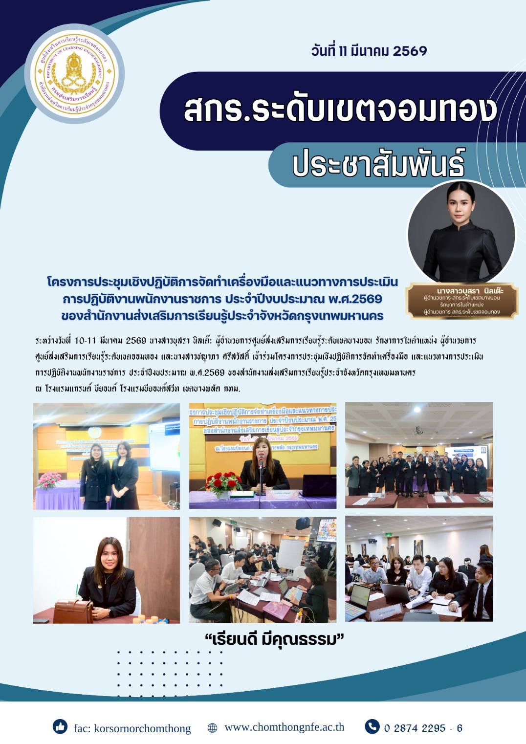 ระหว่างวันที่ 10-11 มีนาคม 2569 นางสาวบุสรา นิลเต๊ะ ผู้อำนวยการศูนย์ส่งเสริมการเรียนรู้ระดับเขตบางบอน รักษาการในตำแหน่ง ผู้อำนวยการ ศูนย์ส่งเสริมการเรียนรู้ระดับเขตจอมทอง และนางสาวชญาภา ศรีสวัสดิ์ เข้าร่วมโครงการประชุมเชิงปฏิบัติการจัดทำเครื่องมือ และแนวทางการประเมินการปฏิบัติงานพนักงานราชการ ประจำปีงบประมาณ พ.ศ.2569 ของสำนักงานส่งเสริมการเรียนรู้ประจำจังหวัดกรุงเทพมหานคร ณ โรงแรมแกรนด์ บียอนด์ โรงแรมบียอนด์สวีท เขตบางพลัด กทม.