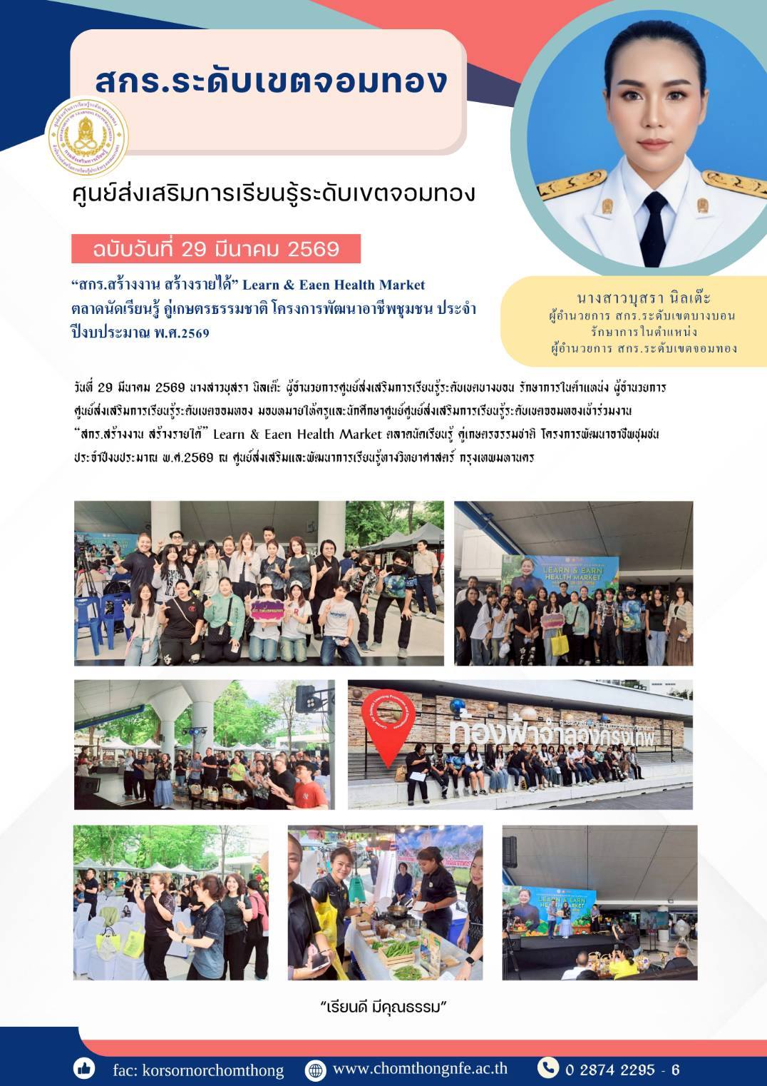 29 มีนาคม 2569 นางสาวบุสรา นิลเต๊ะ ผู้อำนวยการศูนย์ส่งเสริมการเรียนรู้ระดับเขตบางบอน รักษาการในตำแหน่ง ผู้อำนวยการ ศูนย์ส่งเสริมการเรียนรู้ระดับเขตจอมทอง มอบหมายให้ครูและนักศึกษาศูนย์ศูนย์ส่งเสริมการเรียนรู้ระดับเขตจอมทองเข้าร่วมงาน “สกร.สร้างงาน สร้างรายได้” Learn & Eaen Health Market ตลาดนัดเรียนรู้ คู่เกษตรธรรมชาติ โครงการพัฒนาอาชีพชุมชน ประจำปีงบประมาณ พ.ศ.2569 ณ ศูนย์ส่งเสริมและพัฒนาการเรียนรู้ทางวิทยาศาสตร์ กรุงเทพมหานคร
