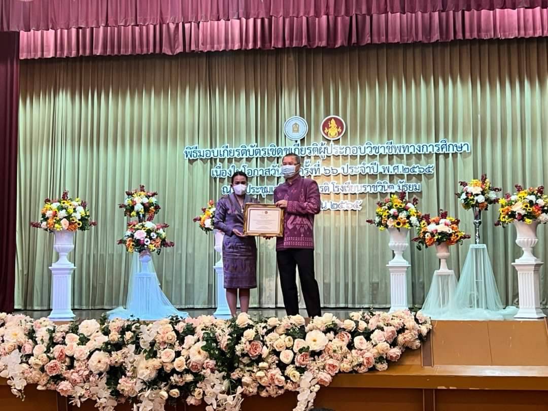 นางสาวบุสรา นิลเต๊ะ ผู้อำนวยการสถานศึกษา เข้ารับมอบเกียรติบัตร บุคคล รัก ศรัทธาและเสียสละ อุทิศตน ในอาชีพเพื่อประโยชน์ทางการศึกษา ได้รับเกียรติบัตรจากท่านสุภัทร จำปาทอง ปลัดกระทรวงศึกษาธิการ เป็นประธานในพิธีมอบเกียรติบัตร