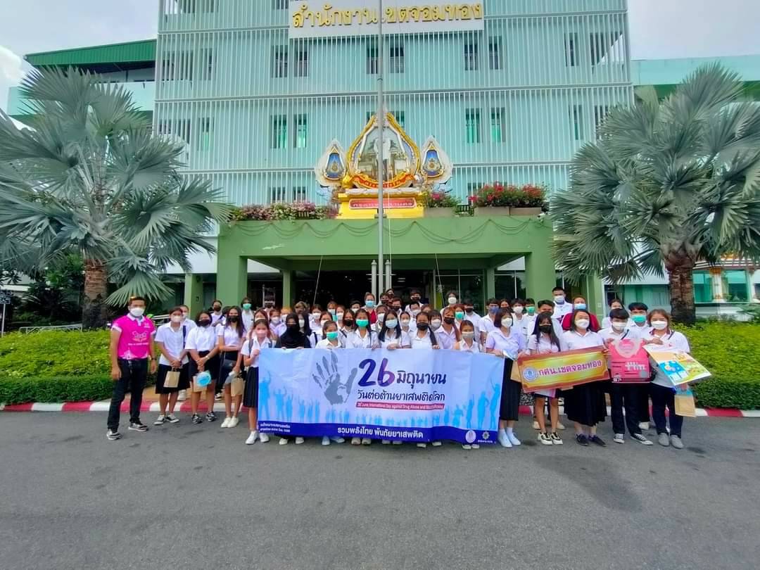 วันที่ 26 มิถุนายน 65 นางสาวบุสรา นิลเต๊ะ ผู้อำนวยการสถานศึกษา ได้มอบหมายให้คณะครู กศน.เขตจอมทอง ร่วมกับนักศึกษาเดินขบวนรณรงค์ต่อต้านยาเสพติด วัตถุประสงค์เพื่อปลูกฝังจิตสำนักให้รู้เท่าทันและห่างไกลจากยาเสพติด